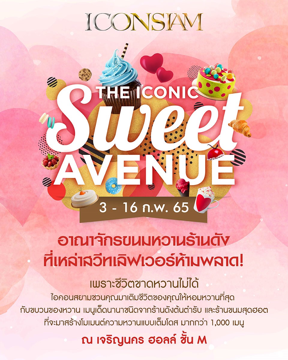 ไอคอนสยาม ร่วมส่งมอบความสุขพร้อมชวนคุณมาเติมพลังเพิ่มความหวานให้อบอวลต้อนรับเทศกาลวาเลนไทน์ ในงาน “ICONSIAM The Iconic Sweet Avenue” (ไอคอนสยาม ดิ ไอคอนิค สวีท อเวนิว) แลนด์มาร์คขนมหวานที่รวบท็อปลิสต์ร้านดังมาไว้ให้ฟินที่เดียว พบกับขบวนขนมหวานนานาชนิดจากร้านดังต้นตำรับ และคาเฟ่สุดฮอตที่คัดสรรมามอบความสุขให้กับทุกคน ได้เต็มอิ่มกับโมเมนต์ความหวานแบบโนลิมิตภายในงานกว่า 1,000 เมนู โดยงานจะจัดขึ้นตั้งแต่วันนี้ – 16 กุมภาพันธ์ ศกนี้ ณ บริเวณ เจริญนคร ฮอลล์ ชั้น M ไอคอนสยาม ภายใต้มาตรการ Covid-Free Setting เพื่อป้องกันการแพร่ระบาดของโรคโควิด 19 ยกระดับความสะอาดตามมาตรฐานความปลอดภัย ด้านสุขอนามัย Amazing Thailand Safety and Health Administration : SHA Plus เพื่อสร้างความมั่นใจให้แก่ผู้ใช้บริการ