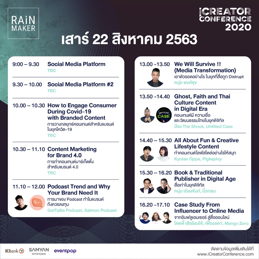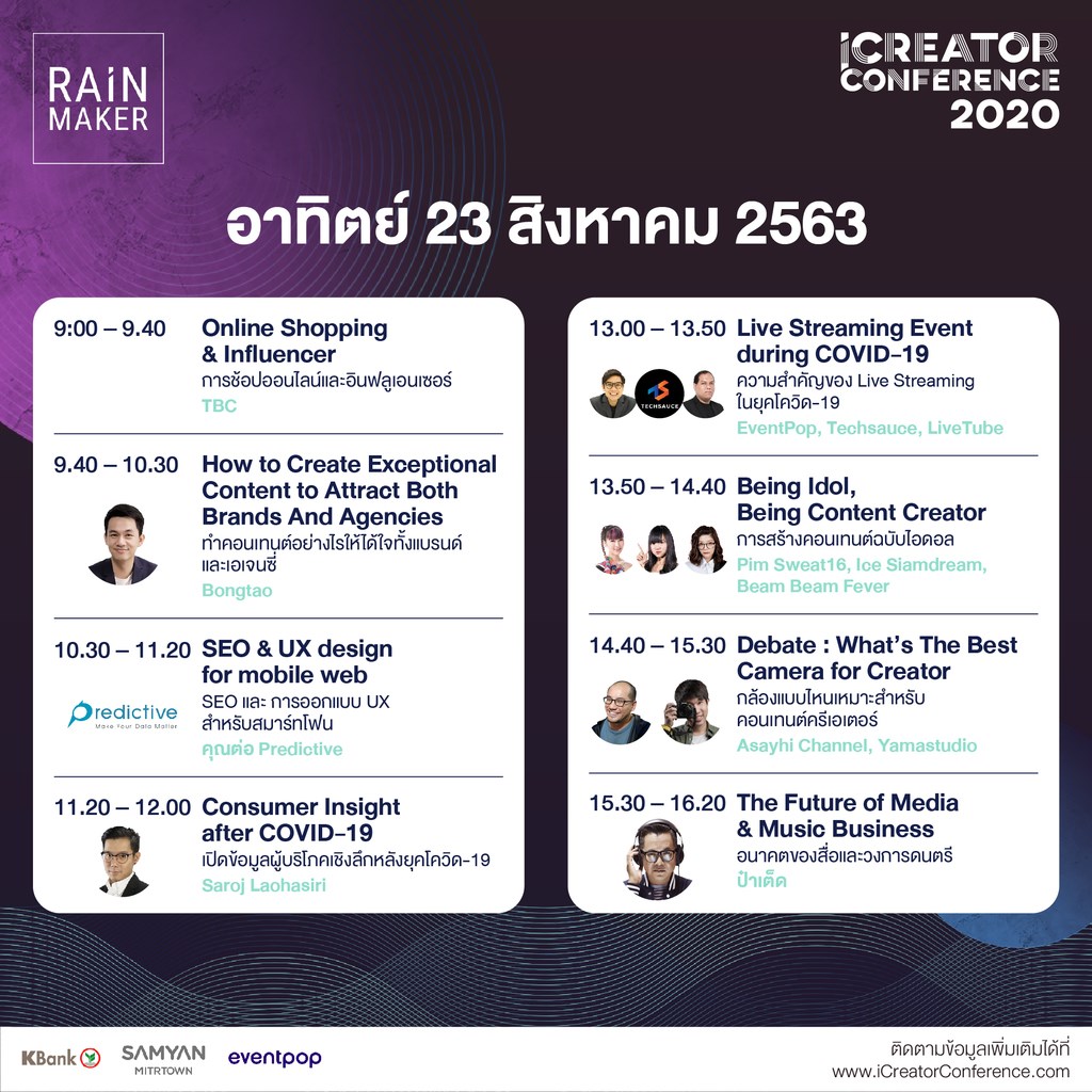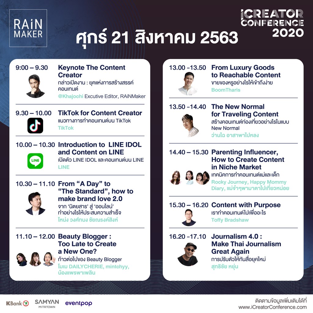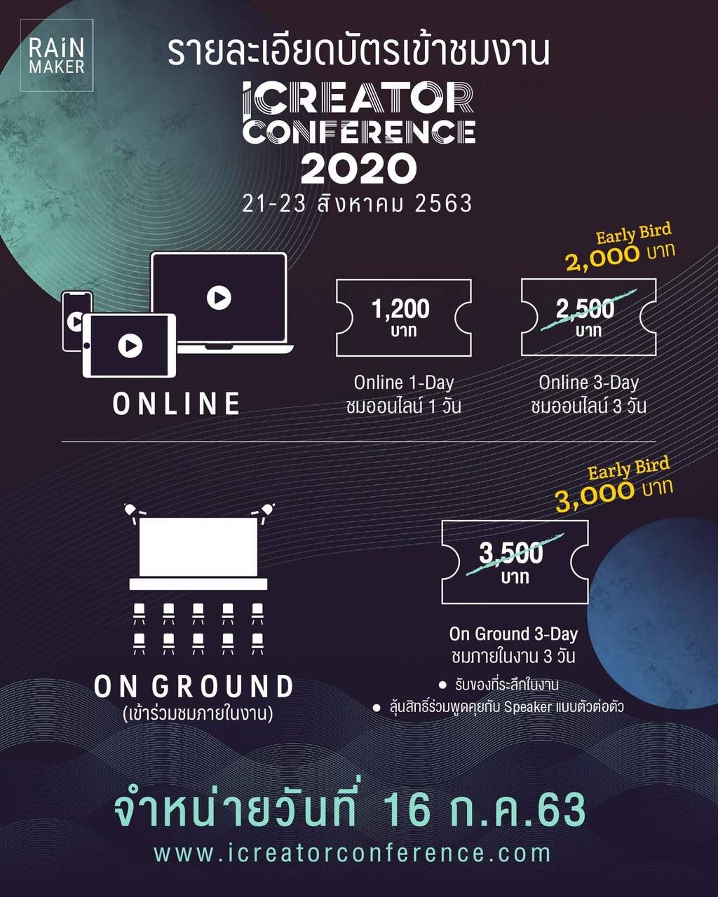 เตรียมพบกับการกลับมาอีกครั้งของ iCreator Conference 2020 งานมหกรรมรวมกลุ่ม Content Creator ชั้นนำครั้งใหญ่ที่สุดในไทย ในวันที่ 21 - 23 สิงหาคม 2563 iCreator Conference คืองานสัมนาที่ร่วมกลุ่มคอนเทนต์ครีเอเตอร์จากหลากหลายวงการ รวมทั้งแพลตฟอร์มในการสร้างสรรค์คอนเทนต์ ทั้ง Facebook, TikTok, Twitter, LINE ฯลฯ