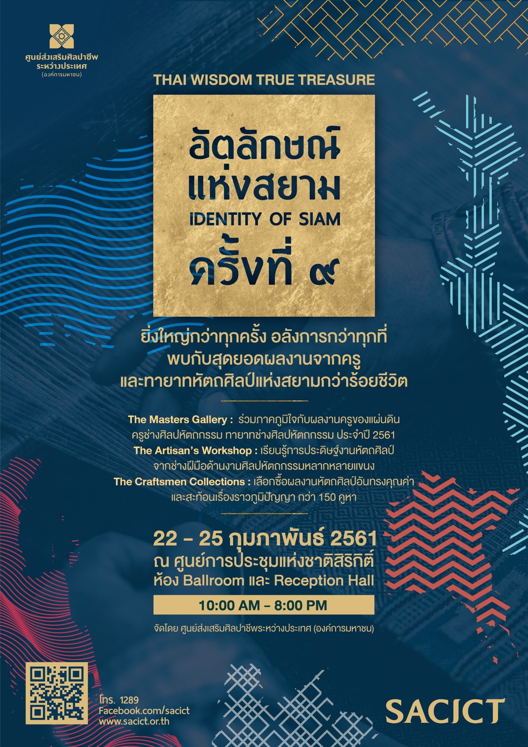 ยิ่งใหญ่กว่าทุกครั้ง อลังการกว่าทุกที่ พบกับสุดยอดผลงานจากครูและทายาทหัตถศิลป์แห่งสยามกว่าร้อยชีวิต ณ งาน "อัตลักษณ์แห่งสยาม ครั้งที่ 9" ระหว่างวันที่ 22-25 กุมภาพันธ์ เวลา 10.00-20.00 น. ศูนย์ประชุมแห่งชาติสิริกิติ์