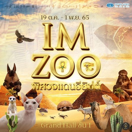 IM ZOO พิศวงแดนอียิปต์ ท่องเมืองอียิปต์พบกับสัตว์แปลกมากมาย พร้อมกิจกรรมสุดสนุก ตั้งแต่วันที่ 19 ต.ค. 65 - 1 พ.ย. 65 เวลา 10.30 - 20.30 น. ณ บริเวณ Grand Hall ชั้น 1 ศูนย์การค้าอิมพีเรียล เวิลด์ สำโรง