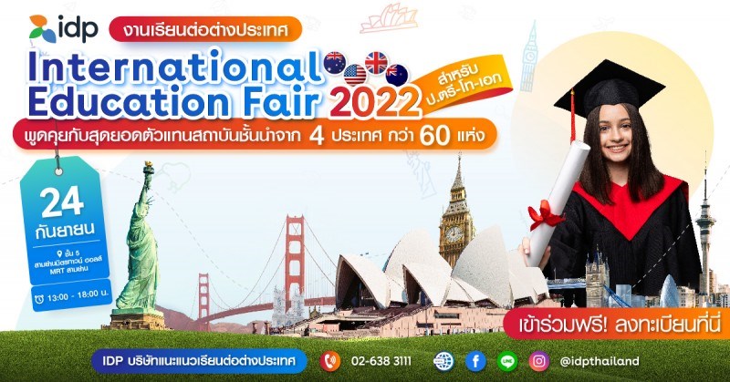 International Education Fair 2022 พูดคุยกับสุดยอดตัวแทนสถาบันชั้นนำจาก 4 ประเทศ สำหรับป.ตรี - โท - เอก กลับมาอีกครั้งกับการรวมตัวแทนสถาบันศึกษาชั้นนำระดับโลกกว่า 60 สถาบัน จากทั้งประเทศออสเตรเลีย อังกฤษ อเมริกา และนิวซีแลนด์ มารวมไว้ที่งานเดียว งานใหญ่แห่งปีที่ไม่ว่าใคร ก็พลาดไม่ได้ พูดคุยกับตัวแทนสถาบันและมหาวิทยาลัย Top 100 ของโลก สอบถามทุกเรื่องการเรียนต่อต่างประเทศอย่างละเอียดไม่ว่าจะเป็น ขั้นตอนการเตรียมตัวเรียนต่อ การคัดเลือกคุณสมบัติเข้าเรียน คณะและหลักสูตรมาแรง รวมถึงข้อมูลทุนการศึกษาสุด Exclusive งานใหญ่แห่งปีที่ช่วยเตรียมทุกความพร้อมการเรียนต่อต่างประเทศให้กับน้อง ๆ มากที่สุด ทุกคำถามที่ข้องใจงานนี้มีคำตอบ ที่สำคัญ เข้าร่วมฟรีตลอดงาน คุ้มว่านี้ไม่มีอีกแล้ว วันเสาร์ที่ 24 กันยายน 2565 เวลา 13.00 - 18.00 น. ที่ชั้น 5 สามย่าน มิตรทาวน์ ฮอลล์ ลงทะเบียนเข้าร่วมงานฟรี คลิก https://bit.ly/InterFair-Aug2022 สิทธิพิเศษภายในงาน ยื่นใบสมัครภายในงาน ฟรี ข้อมูลทุนการศึกษาแบบจัดเต็ม พร้อมโอกาสในการรับทุน ข้อมูลคอร์สเรียน หลักสูตรมาแรง ค่าใช้จ่าย ข้อมูลจุดเด่นของแต่ละสถาบัน รูปแบบการเรียนการสอน ฟรี บริการสมัครสอบ IELTS พร้อมรับของสมมนาคุณ ไฮไลต์ พบกับตัวแทนมหาวิทยาลัยชั้นนำจากประเทศออสเตรเลีย Group of Eight พบกับตัวแทนมหาวิทยาลัยชั้นนำจากประเทศอังกฤษ พบกับตัวแทนมหาวิทยาลัยชั้นนำจากสหรัฐอเมริกา ฟรี ปรึกษาเจ้าหน้าที่แนะแนวผู้เชี่ยวชาญจาก IDP พร้อมดำเนินการฟรี ทุกขั้นตอน