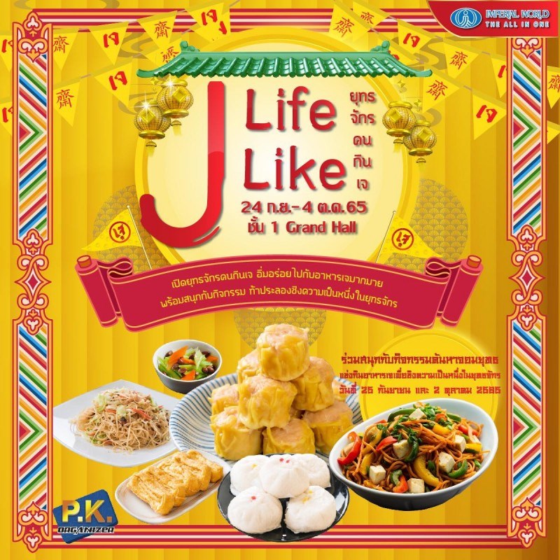 J Life J Like วันที่ 24 กันยายน - 4 ตุลาคม 2565 ณ ศูนย์การค้าอิมพีเรียล เวิลด์ สำโรง J Life J Like ยุทรจักรคนกินเจ เปิดยุทธจักรคนกินเจ อิ่มอร่อยไปกับอาหารเจมากมาย พร้อมสนุกกับกิจกรรม ท้าประลองชิงความเป็นหนึ่งในยุทธจักร วันที่ 24 ก.ย. - 4 ต.ค. 65 เวลา 10.30 - 20.30 น. ณ บริเวณ Grand Hall ชั้น 1 ศูนย์การค้าอิมพีเรียล เวิลด์ สำโรง พิเศษ กิจกรรมค้นหาจอมยุทธแข่งกินอาหารเจ เพื่อชิงความเป็นหนึ่งในยุทธจักร วันที่ 25 ก.ย. 65 และ วันที่ 2 ต.ค. 65