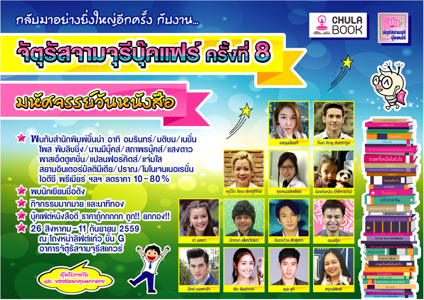 ขอเชิญมาช็อปหนังสือกันที่งาน จัตุรัสจามจุรีบุ๊คแฟร์ ครั้งที่ 8 มหัศจรรย์วันหนังสือ โปรโมชันสุดคุ้มสำหรับคนรักหนังสือต้องหยุดตัวเองไม่อยู่ ให้นักอ่านได้เลือกสรรกันถึงที่ ภายในงาน จัตุรัส จามจุรีบุ๊คแฟร์ ครั้งที่ 8 ณ อาคารจามจุรีสแควร์ บริเวณโถงชั้น G จุฬาลงกรณ์มหาวิทยาลัย ระหว่างวันที่ 26 สิงหาคม - 11 กันยายน 2559