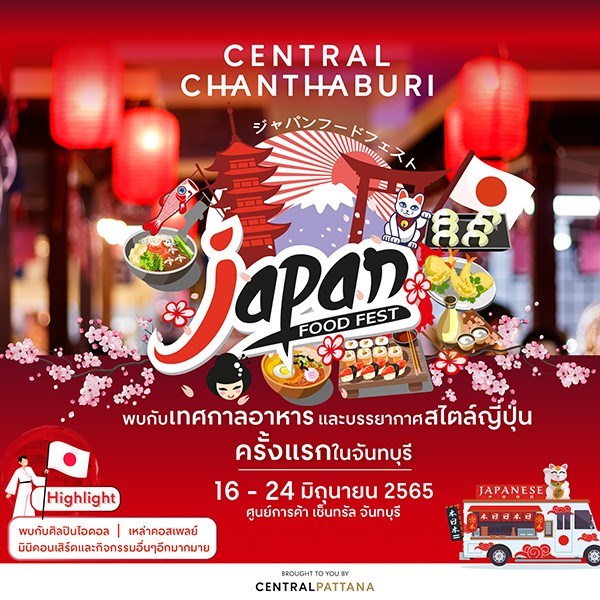Japan Food Fest วันที่ 16 - 24 มิถุนายน 2565 ณ เซ็นทรัล จันทบุรี เตรียมพบกับเทศกาลอาหารและบรรยากาศสไตล์ญี่ปุ่นครั้งแรกในจันทบุรี อิ่มอร่อยไปกับเมนูคาวหวานแบบต้นตำรับ มุมถ่ายรูปแสนคาวาอี้ ท่ามกลางบรรยากาศญี่ปุ่นสุดฟิน ตะลุยช้อป ชิม ชิล ได้ฟีลบินไปญี่ปุ่น ภายในงานมีกิจกรรมไฮไลต์ ได้แก่ พบกับศิลปินไอดอล เหล่าคอสเพลย์ มินิคอนเสิร์ตและมุมถ่ายรูปสุดปัง ชวนชาวแก๊งมาเที่ยวญี่ปุ่นกันเถอะ วันที่ 16 - 24 มิ.ย. 65 ณ ลานกิจกรรม (โซน Semi Outdoor) ชั้น G เซ็นทรัล จันทบุรี