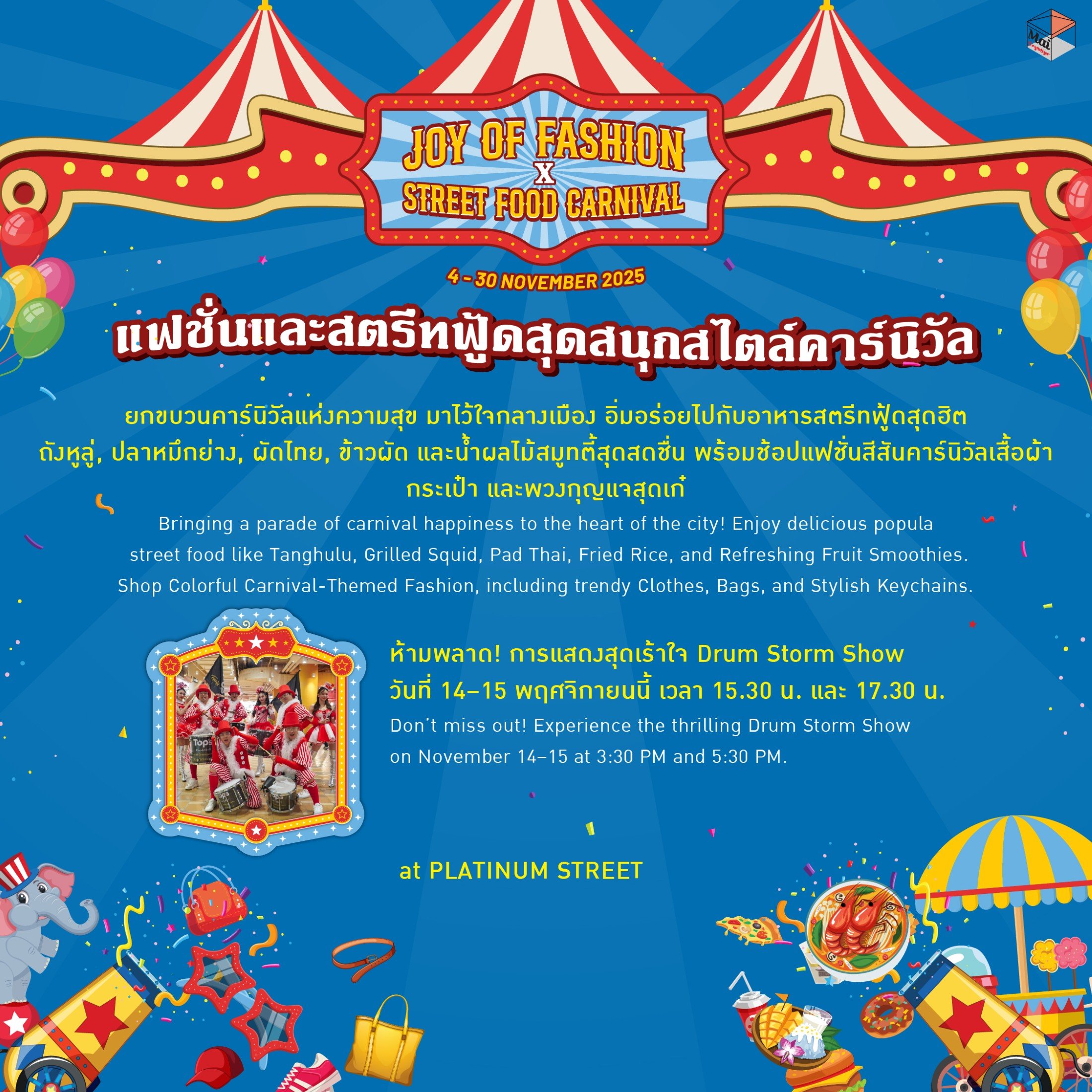 ศูนย์การค้าแพลทินัม ชวนช้อปชิลในงาน Joy of Fashion x Street Food Carnival แฟชั่นและสตรีทฟู้ด    สุดคึกคักสไตล์คาร์นิวัล ยกขบวนคาร์นิวัลแห่งความสุข มาไว้ใจกลางเมือง เชิญอิ่มอร่อยไปกับเมนูซีฟู้ดสุดฮิต อาทิ  ผัดไทย ข้าวผัด ปลาหมึกย่าง บาร์บีคิว และอีกมากมาย สนุกกับการช้อปสินค้าแฟชั่น อาทิ เสื้อผ้า กระเป๋า พวงกุญแจ และของตกแต่งบ้านสุดเก๋ มากกว่า 70 ร้านค้า ตั้งแต่วันนี้ ถึงวันที่ 30 พฤศจิกายน 2568 ณ ศูนย์การค้าแพลทินัม ติดตามรายละเอียดร้านค้าและโปรโมชั่นเพิ่มเติมได้ทาง Facebook : Platinum Fashion Mall แพลทินัม แฟชั่น มอลล์