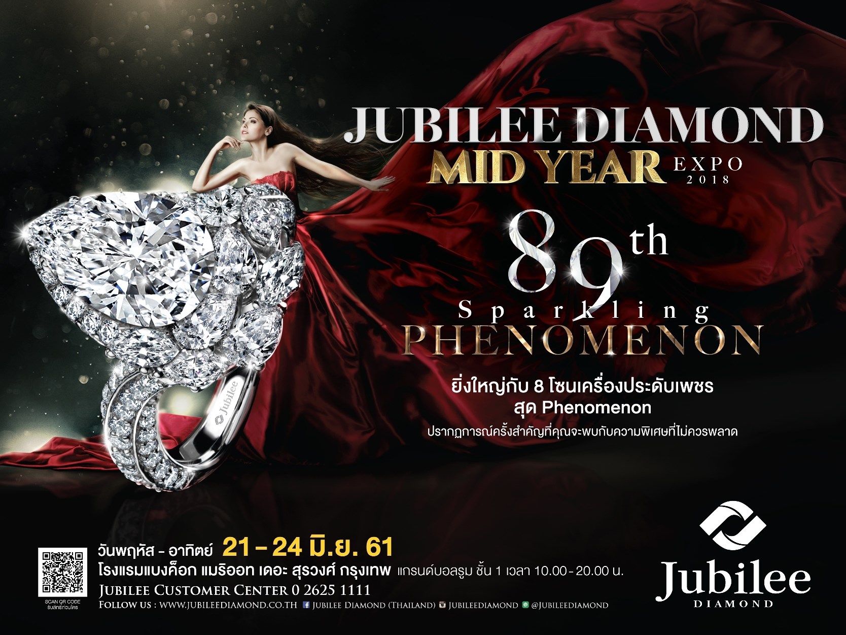ร่วมสัมผัสความงดงามจากเพชรแท้แบรนด์คนไทยคุณภาพระดับโลก พร้อมโปรโมชั่นสุดพิเศษทั้งงาน เครื่องประดับเพชรลดสูงสุด 50%, Buy 1 Get 1 ซื้อแหวนเจ้าสาว แถมฟรีแหวนเจ้าบ่าว, ซื้อเพชรแจกเพชร พร้อมรับเพิ่มของสมนาคุณอีกมากมาย, โปรโมชั่นผ่อน 0% นาน 4 เดือน และรับเครดิตเงินคืนสูงสุด 300,000 บาท ในงานฉลองครบรอบ 89 ปี “ยูบิลลี่ ไดมอนด์ มิดเยียร์ เอ็กซ์โป 2018 : เดอะ 89 สปาร์คกลิ้ง ฟีโนมินอน” ในระหว่างวันที่ 21 – 24 มิถุนายน 2561 เวลา 10.00 – 20.00 น. ณ แกรนด์บอลรูม ชั้น 1 โรงแรมแบงค็อก แมริออท เดอะ สุรวงศ์ กรุงเทพ