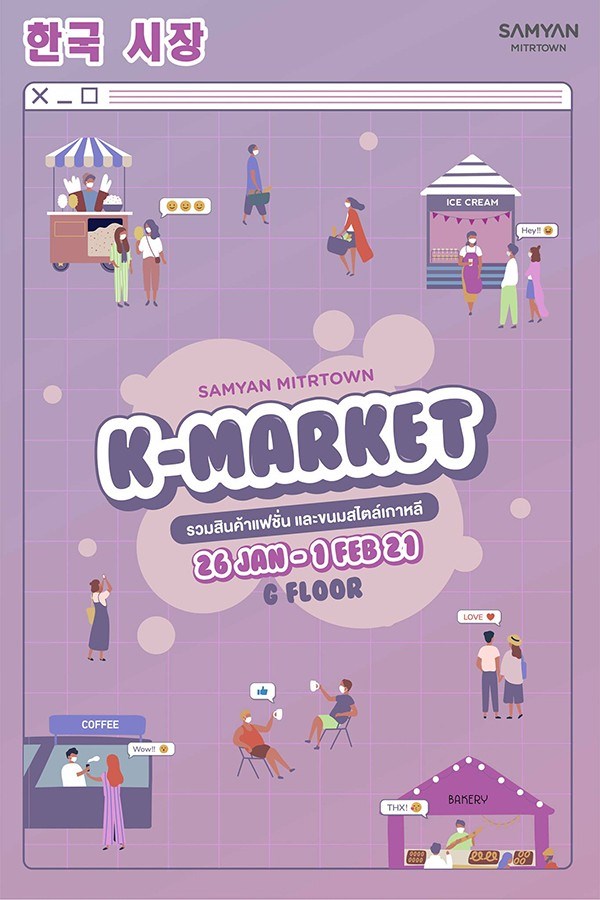 K-MARKET วันที่ 26 มกราคม - 1 กุมภาพันธ์ 2564 ณ สามย่านมิตรทาวน์ อันยองอาเซโย สำหรับใครที่เป็นสายเกา มาอิ่มจุก ๆ เดินเพลินๆกับงาน "K-MARKET" ที่ศูนย์การค้าสามย่านมิตรทาวน์ มาเลือกอิ่มอร่อยไปกับร้านเครื่องดื่ม ที่คุณไม่ควรพลาด เริ่มด้วยร้าน K-strEAT ที่มาพร้อมกับเมนูขายดีอาทิ ต๊อกบกกี, ทักกันจอง (ไก่ทอดฮอตชิลลี่) , คิมบับ โปซองกิมบับ หรือจะเป็นร้าน TUDARI ที่มาในเมนู Bibimbub, Jajangmyun, Kimchi, Vegan Kimbap ทั้งนี้ยังมีร้าน DGB ที่มาพร้อม กิมจิแบบพร้อมทานหรือนำไปแช่เย็นที่บ้าน และคิมบับบุลโกกิ, คิมบับทูน่า นอกจากอาหารแล้วยังมีร้านชาเขียวดี ๆ รสชาติเข้ม ๆ อย่างร้าน Teasana ในเมนูแนะนำ Hojicha Coconut, โฮจิฉะ ชาเขียวคั่ว ชงสดตีลงน้ำมะพร้าวสไตล์คั่ว ๆ ที่สำคัญเหล่าบลิ้งค์ไม่ควรพลาด! กับของสะสมน่ารัก ๆ ของเกิร์ลกรุ๊ปสุดฮอต BLACKPINK อาทิ BLACKPINK Micro Pop star, BLACKPINK Broken Heart Superstars และ Light -Up Plush Heart และใครที่เป็นแฟนตัวยง BTS ไม่มีใครไม่รู้จักคาแรคเตอร์สุดคิ้วท์ BT21 กับไอเท็มให้แฟนได้เก็บสะสม อย่างปากกา กล่องใส่ปากกา สติกเกอร์ และอื่น ๆ อีกมากมายแล้ว จากร้าน Medium and More แล้วพบกันงาน "K-MARKET" ตั้งแต่วันที่ 26 ม.ค. - 1 ก.พ. 64 นี้ เวลา 10.00 - 21.00 น. ที่บริเวณชั้น G (หน้าร้าน KFC) สามย่านมิตรทาวน์
