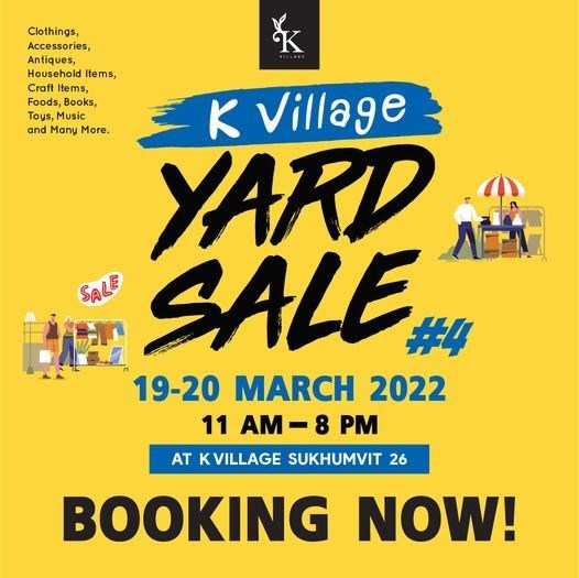 ถึงเวลาที่ทุกคนรอคอย มาปล่อยมือสอง ของสวยกันในงาน K Village Yard Sale #4 จัดขึ้นในวันที่ 19 - 20 มีนาคม 2565 รับร้านค้ามือสองทุกประเภท ไม่ว่าจะเป็น เสื้อผ้า เครื่องประดับ ของแบรนด์เนม ของใช้ ของสะสม กล้อง แผ่นเสียง ของแต่งบ้าน และร้านอาหาร ร้านค้าไหนสนใจจองบูธ คลิก Link เพื่อลงทะเบียนได้เลย https://forms.gle/bug7s6ghQgFSNwZVA