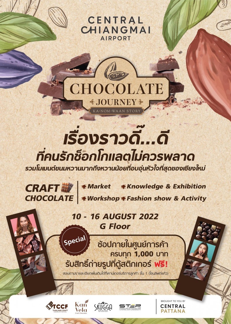 Ka-Nom-Waan Story : Chocolate Journey วันที่ 10 - 16 สิงหาคม 2565 ณ ศูนย์การค้าเซ็นทรัล เชียงใหม่ แอร์พอร์ต งาน Ka-Nom-Waan Story : Chocolate Journey วันที่ 10 - 16 ส.ค. 2022 ณ ลานกิจกรรม ชั้น G ศูนย์การค้าเซ็นทรัล เชียงใหม่ แอร์พอร์ต กิจกรรมภายในงานจาก TCCF Chocolate Journey : workshop ที่เป็นเส้นทางการเรียนรู้ช็อกโกแลตจาก 3 stations Cacao Farm: สัมผัสผลสดกับชาวสวนตัวจริง ไร่ชวนฝัน ลำปาง แกะเปลือก และใส่ลงถังหมัก Cacao Bean: เดินทางต่อที่เมล็ดโกโก้แห้ง พิเศษได้สัมผัสเมล็ดโกโก้ Thailand Best Cacao Bean 2022 จากการประกวด Grand Cacao Championship Craft Chocolate: ชมสาธิตการใช้เครื่องโม่ช็อกโกแลตและนำไปทำเป็นเครื่องดื่ม กลับบ้านไปเลยโดย TARM craft chocolate วันที่ 13 - 14 สิงหาคม 2565 เปิด 4 รอบ เวลา 11.00 / 13.00 / 15.00 / 17.00 น. ราคา 299.- สามารถมาซื้อตั๋วได้หน้างาน ชั้น G Chocolate Market: Special Edition ชวนครอบครัวช็อกโกแลตมาออกร้านขายคราฟต์ช็อกโกแลตทั้งช็อกโกแลตบาร์และเครื่องดื่มมากมาย Khom Chocolatier House - ขม ช็อกโกลาเทียร์เฮาส์ TARM craft chocolateTARM craft chocolate โกโก้ดอย Cocoa Doi นอกจากนี้ยังมีคราฟต์ช็อกโกแลตแบรนด์ดังอีกมากมาย อาทิ Siamaya Chocolate, KanVela Crafted Chocolate, Vocoa, Pran Cocoa, Lyke & Lia, Wow! Brownie, โกโกไอ้ต้น, เวียงจุมออน มากาลอง และอื่น ๆ อีกมากมาย