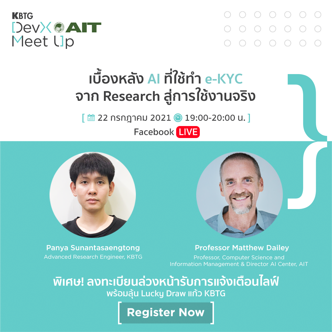 KBTG DevX Meetup รอบนี้ เรามี Expert ด้านงานวิจัยขั้นสูง 2 คนที่จะมาแชร์เบื้องลึกจากประสบการณ์ในการสร้างเทคโนโลยียืนยันตัวตนด้วย Biometrics ว่ามีที่มาอย่างไร พัฒนาจากการวิจัยด้วย Methodology ไหนบ้าง และทิศทางการพัฒนาด้าน Computer Vision และ AI ในอนาคตจะไปทิศทางไหนและจะนำไปใช้งานจริงได้อย่างไร