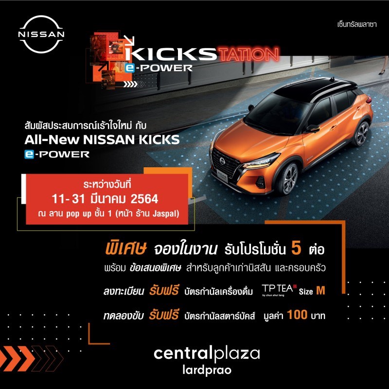 KICKSTATION e-POWER วันที่ 11 - 31 มีนาคม 2564 ณ ลาน pop up ชั้น 1 (หน้า ร้าน Jaspal) เซ็นทรัลพลาซา ลาดพร้าว ร่วมสัมผัสประสบการณ์เร้าใจใหม่ กับ All-New NISSAN KICKS e-power พบกับรถยนต์ KICKS E-power ได้จริงภายในงาน พร้อมพูดคุยกับที่ปรึกษาการขายที่คอยให้คำแนะนำอยู่ตลอดทั้งงาน จัดเต็มทุกเทคโนโลยีสุดล้ำ ครบจบในที่เดียว! สุดพิเศษ! ลงทะเบียนทดลองขับรับบัตรกำนัล Starbucks มูลค่า 100 บาท หรือลงทะเบียนความสนใจภายในงานรับบัตรกำนัล TP Tea