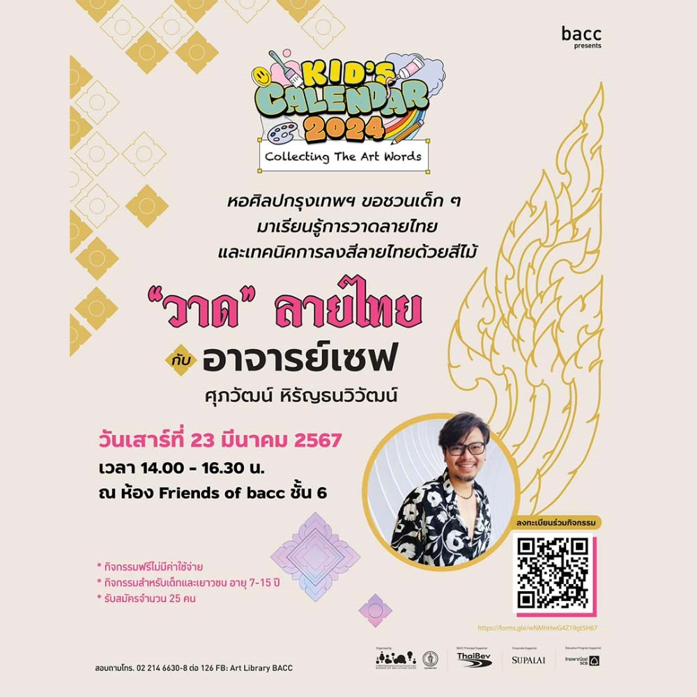 เดือนมีนาคมนี้ หอศิลปกรุงเทพฯ ชวนเด็ก ๆ มาร่วมสนุกสนานไปกับกิจกรรมการเรียนรู้สำหรับเยาวชน Kid’s Calendar 2024: Collecting Art Words ตอน “วาด” ลายไทยกับอาจารย์เซฟ ศุภวัฒน์ หิรัญธนวิวัฒน์ โดยได้หยิบยกคำว่า “วาด” มาผสมผสานกับ “ลายไทย” จึงเกิดกิจกรรมวาดลายไทย ลวดลายที่เราได้เห็นตามวัดวาอาราม หรืออาคารที่มีการออกแบบด้วยสถาปัตยกรรมไทย แต่เราอาจไม่เคยรู้จักชื่อหรือวิธีการวาดลวดลายเหล่านี้ โดยมีอาจารย์เซฟ หรือผู้ช่วยศาสตราจารย์ศุภวัฒน์ หิรัญธนวิวัฒน์ จากสาขาวิชาสถาปัตยกรรมไทย คณะสถาปัตยกรรมศาสตร์ จุฬาลงกรณ์มหาวิทยาลัย มาเป็นวิทยากร แนะนำวิธีวาดลายไทยอย่างง่าย ๆ และสอนเทคนิคการลงสีลายไทยด้วยสีไม้ รวมทั้งเล่าเรื่องราวเกร็ดเล็กเกร็ดน้อยเกี่ยวกับลายไทยให้เด็ก ๆ ได้ฟัง