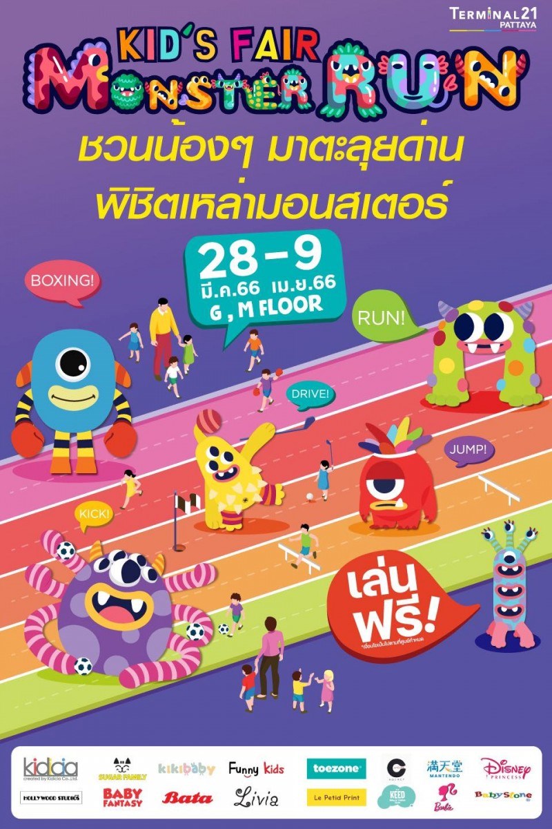 ครั้งแรกในพัทยาพบกับงาน Kid’s Fair จำหน่ายเสื้อผ้าแฟชั่นเด็ก จากหลากหลายแบรนด์ดัง ในธีม Monster Run ร่วมสนุกเกมส์แข่งขันกีฬา Monster Run พิชิตด่านกับเหล่ามอนสเตอร์สุดคิ้วท์ ที่ยกขบวนมาบุกเทอร์มินอล21 พัทยา ร่วมแข่งขันฝ่าด่านต่าง ๆ เพื่อรับรางวัล และกิจกรรมร่วมสนุก ฟรี! สำหรับเด็ก ๆ อีกมากมาย
