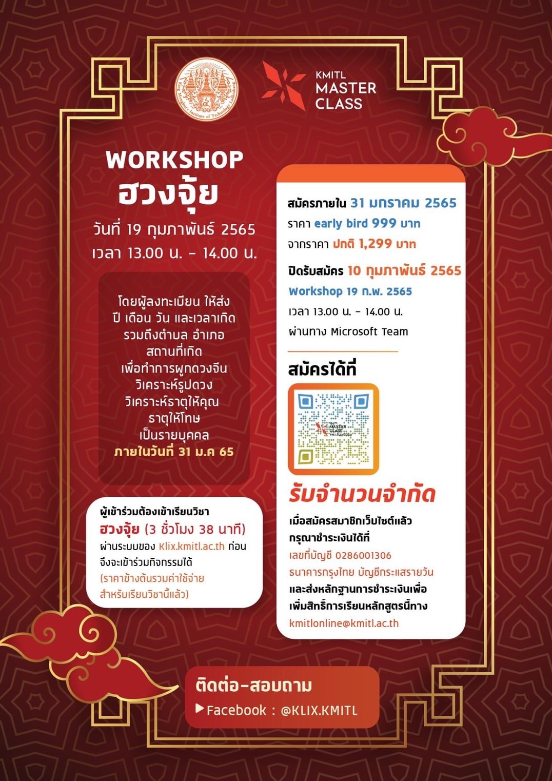 สถาบันเทคโนโลยีพระจอมเกล้าเจ้าคุณทหารลาดกระบัง (สจล.) ชวนสายมูเตลูร่วมเวิร์คชอป “ศาสตร์แห่งฮวงจุ้ย” พร้อมรับใบประกาศนียบัตร ภายใต้โครงการ KMITL Masterclass เรียนรู้ศาสตร์ฮวงจุ้ยขั้นพื้นฐาน นับตั้งแต่การศึกษาถึงความหมายและหลักการของฮวงจุ้ยที่ถูกต้องตามระบบของวิชาที่มีวิทยาศาสตร์รองรับ ทั้งการทำความเข้าใจถึงความสำคัญของวิชาดวงจีน ฤกษ์ยามที่ดี การจัดวางป้ายร้านค้า การสร้างและรักษาสมดุลหยิน-หยาง หลักการ 5 ธาตุแท้ที่อยู่รอบตัว การจัดฮวงจุ้ยภายในบ้านและนอกบ้าน ฯลฯ เพื่อให้ทุกคนสามารถนำไปประยุกต์ใช้ในชีวิตประจำวัน หรือนำไปปรับใช้เพื่อให้สามารถอยู่ร่วมกับผู้อื่นได้อย่างมีความสุข ดำเนินการสอนโดย ‘อาจารย์อิม’ ผศ.ดร.สวามินี นวลแขกุล ผู้เชี่ยวชาญด้านพัฒนาผลิตภัณฑ์ ที่ปรึกษาด้านพัฒนาผลิตภัณฑ์อาหาร นักเขียน ที่ปรึกษาด้านการลงทุนและการจัดฮวงจุ้ย ทั้งนี้ กิจกรรมดังกล่าวมีกำหนดจัดขึ้นในวันที่ 19 กุมภาพันธ์ 2565 เวลา 13.00 – 14.00 น.