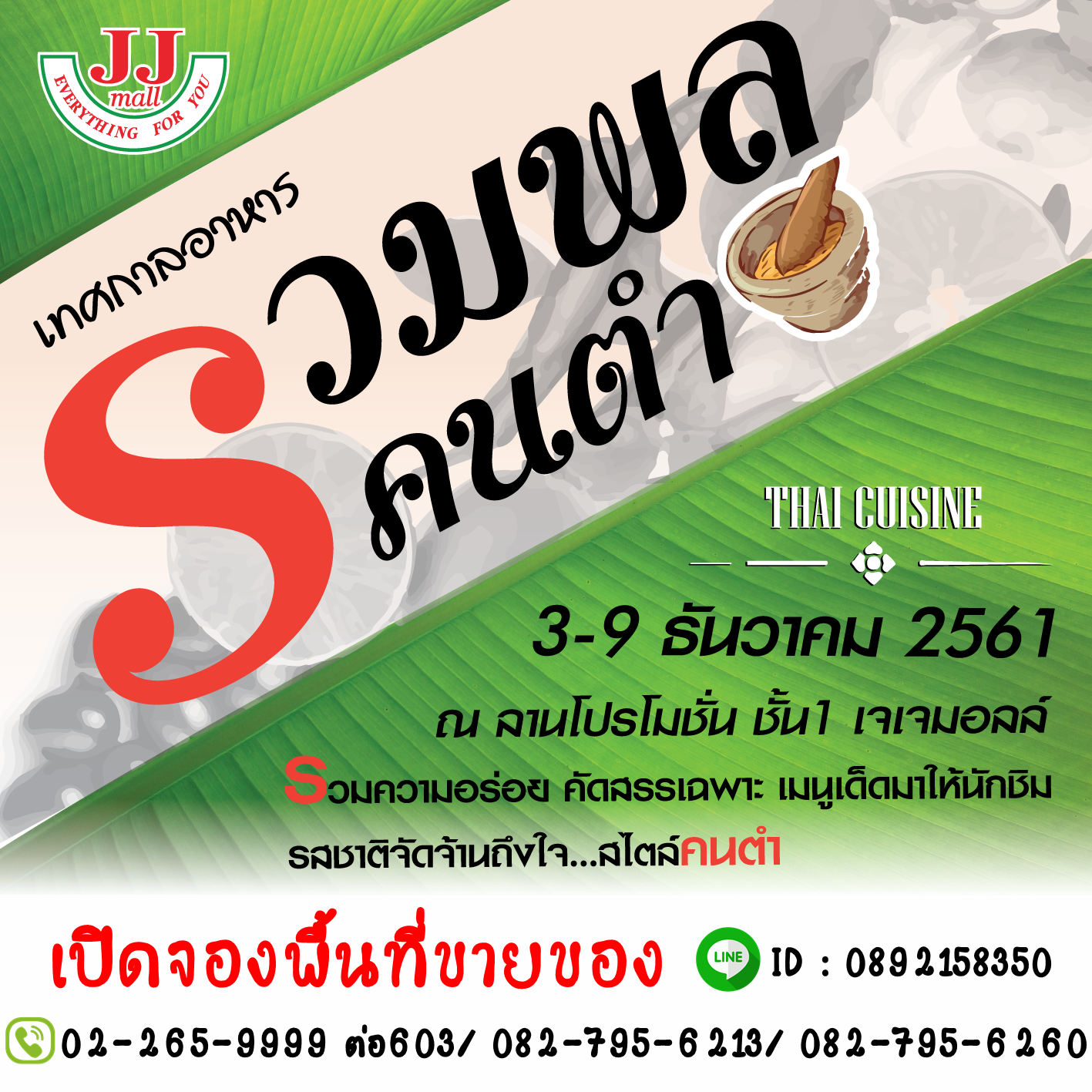 เปิดจองบูธ งานเทศกาลอาหารรวมพลคนตำ ซึ่งงานจะจัดขึ้นระหว่างวันที่ 3-9 ธันวาคม 2561 บริเวณลานโปรโมชั่นชั้น 1 ศูนย์การค้าเจ.เจ.มอลล์