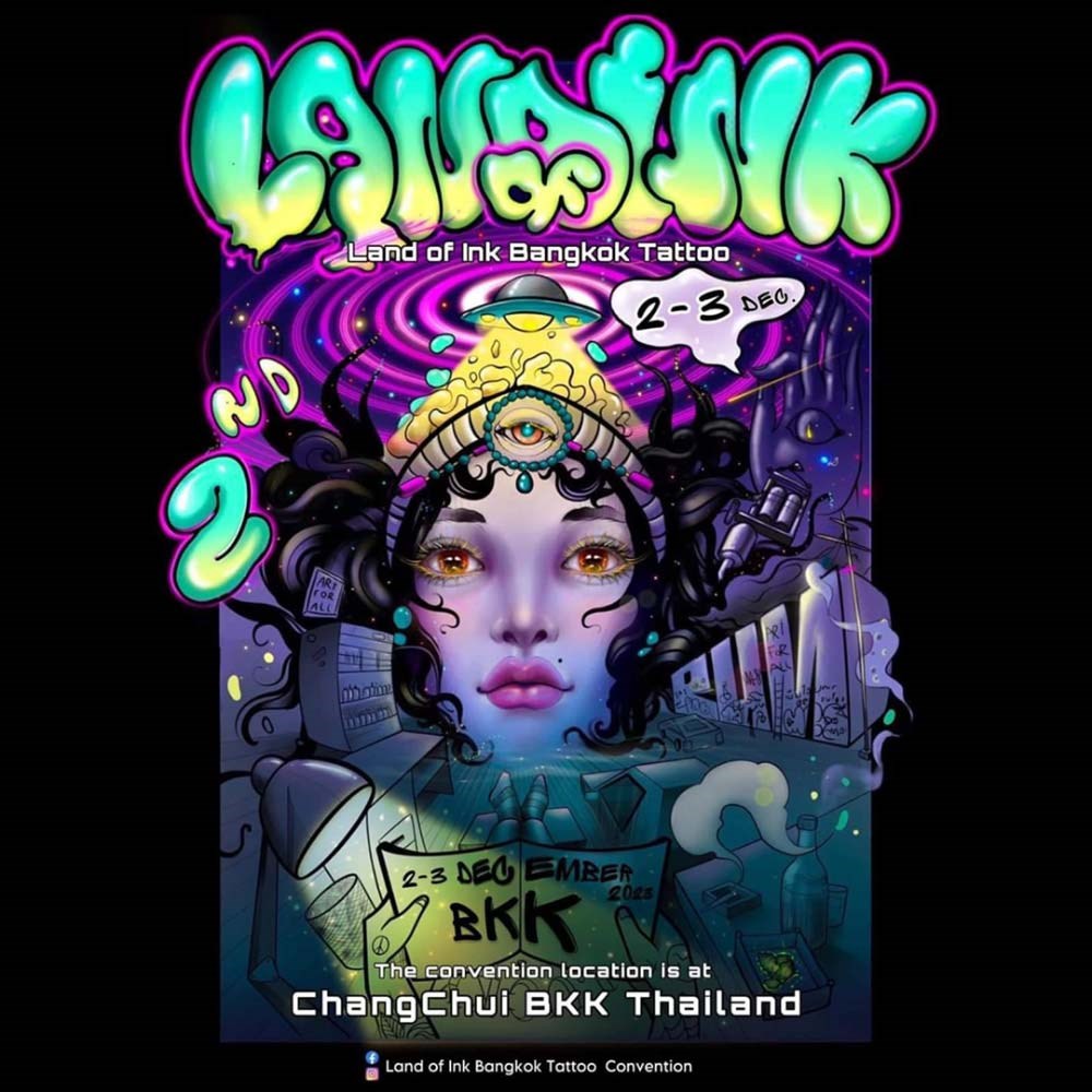 Land of Ink Bangkok Tattoo Convention งานแสดงรอยสัก และประกวดรอยสัก ของช่างสักระดับมืออาชีพทั้งไทยและนานาชาติ วันเสาร์ 2 - อาทิตย์ 3 ธันวาคม 2566 เวลา 11.00 - 23.00 น. ที่ ช่างชุ่ย Creative Park ปิ่นเกล้า (อาคาร อาเหนกป้าสง+ช่างเชื่อม)