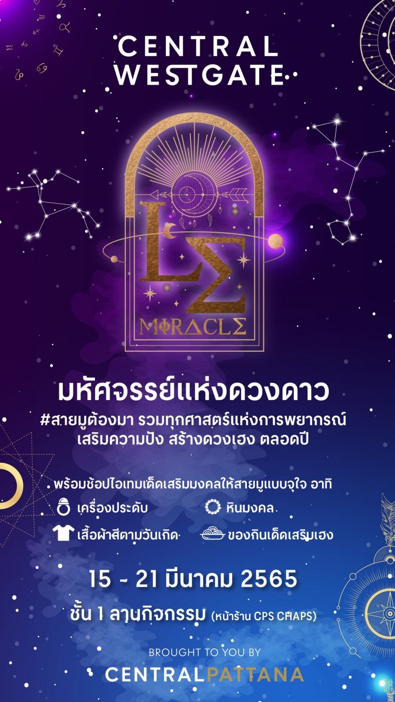 LE Miracle วันที่ 15 - 21 มีนาคม 2565 ณ ศูนย์การค้าเซ็นทรัล เวสต์เกต LE Miracle : มหัศจรรย์แห่งดวงดาว สายมูต้องมา ยกทุกศาสตร์แห่งการพยากรณ์ มาไว้ที่เดียว ทั้งดูลายมือ ไพ่ป๊อก เลขมงคล เสริมความปัง สร้างดวงเฮงตลอดปี พร้อมช้อปไอเทมเด็ดเสริมมงคลให้สายมูแบบจุใจ อาทิ เครื่องประดับ, หินมงคล, เสื้อผ้าสีตามวันเกิด ของกินเด็ดเสริมเฮง และอีกมากมาย มาร่ายมนต์เสริมความปังแบบตลอดปี ตั้งแต่วันนี้ - 21 มีนาคม 2565 ณ ชั้น 1 ลานกิจกรรม (ฝั่งร้าน CPS CHAPS) ศูนย์การค้าเซ็นทรัล เวสต์เกต