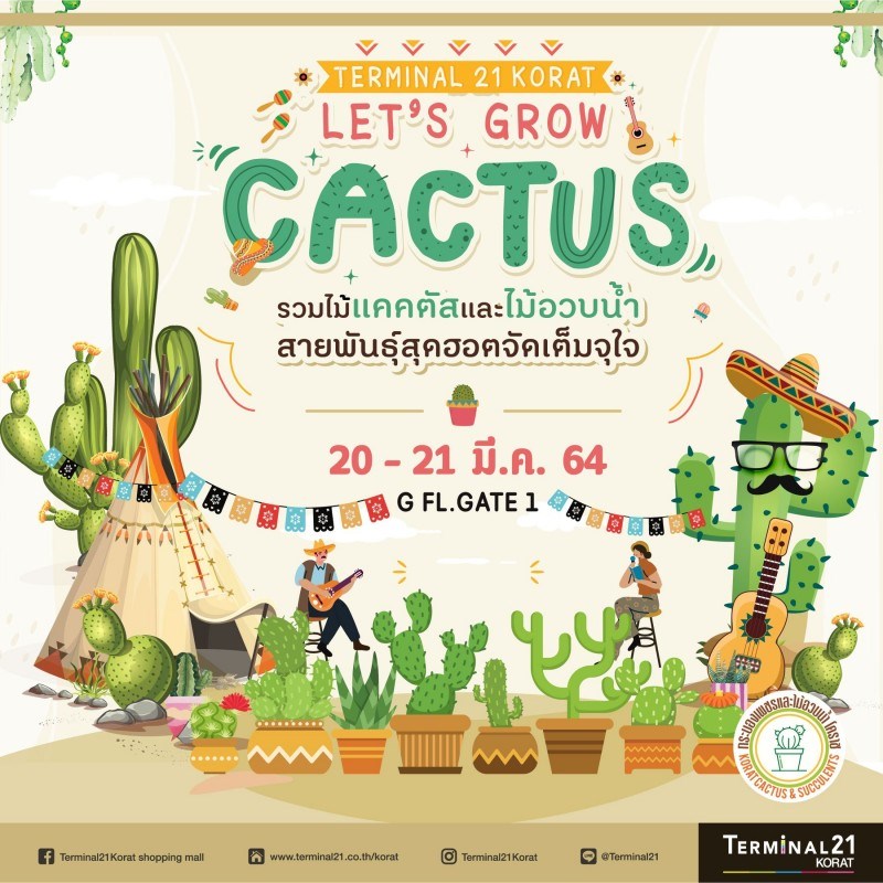 Let's Grow Cactus วันที่ 20 - 21 มีนาคม 2564 ณ ชั้น G-Gate 1 Terminal21 โคราช สาวกแคคตัส เตรียมตัวให้พร้อม กับตลาดนัดกระบองเพชร พันธุ์ไม้สุดคิ้วและไม้อวบน้ำกว่า 100 ร้าน ที่งาน Let's Grow Cactus วันที่ 20 - 21 มี.ค. 64 ชั้น G-Gate 1 Terminal21 โคราช จัดเต็มด้วยกิจกรรม อาทิ โซนโชว์ไม้แปลก,การจัดสวนถาด พร้อมแจกคู่มือ การเลี้ยงแคคตัสแบบน่ารัก ๆ ฟรีไม่มีค่าใช้จ่าย พิเศษ สมาชิก T21 Reward รับฟรี ต้นกระบองเพชร 1 ต้น