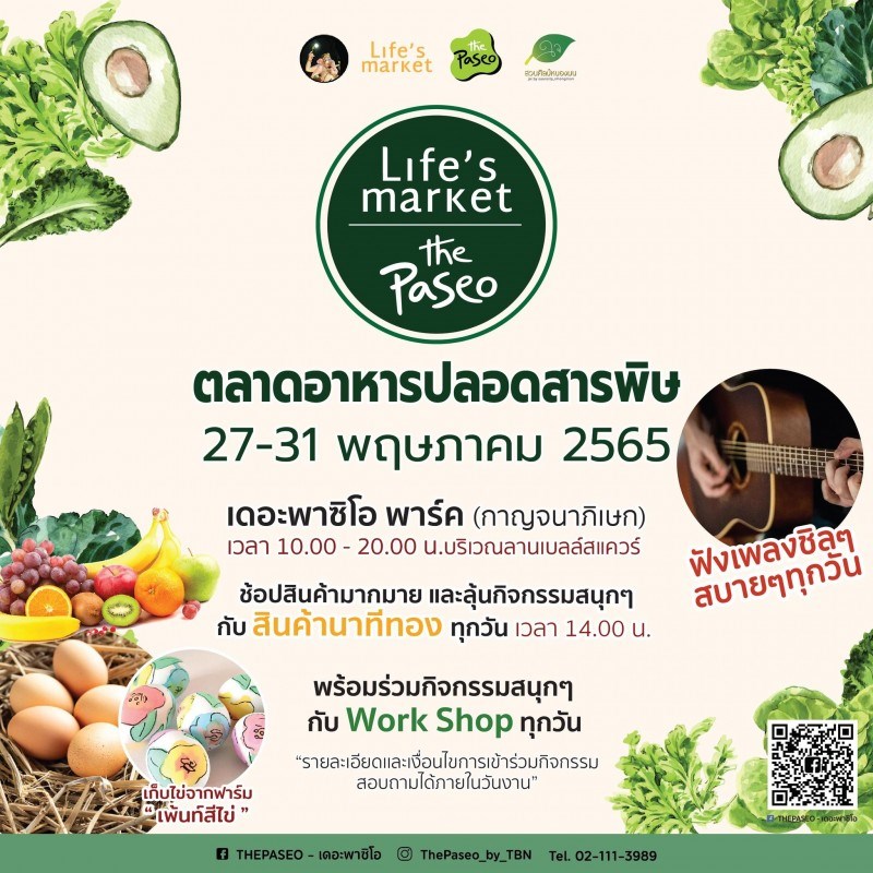 เตรียมพบกับ กิจกรรมดีที่ไม่ควรพลาด ขอเชิญช้อปผลิตภัณฑ์ออร์แกนิค ปลูกโดยวิธีธรรมชาติ 100% ไร้สารเคมีใด ๆ ส่งตรงจากเกษตรกร ฟาร์มคุณภาพดี มาให้เลือกซื้อภายในงาน Life’s Market เดอะพาซิโอพาร์ค กาญจนาภิเษก ภายในงานนอกจากจะมีผลิตภัณฑ์ออร์แกนิคธรรมชาติ สด ๆ ใหม่ ๆ แล้ว ยังได้พบกับกิจกรรม Workshop ที่จัดเต็มมากครั้งนี้ อาทิเช่น แปลงนาสาธิต, เพ้นท์ภาพบนไข่ไก่สด ได้ทั้งความรู้และความสนุก สามารถร่วมทำกิจกรรมกันได้ทั้งครอบครัว แล้วมาพบกันที่งาน Life’s Market วันที่ 27 - 31 พฤษภาคม 2565 เวลา 10.00 - 20.00 น. ณ เดอะพาซิโอพาร์ค กาญจนาภิเษก บริเวณลานเบลล์สแควร์