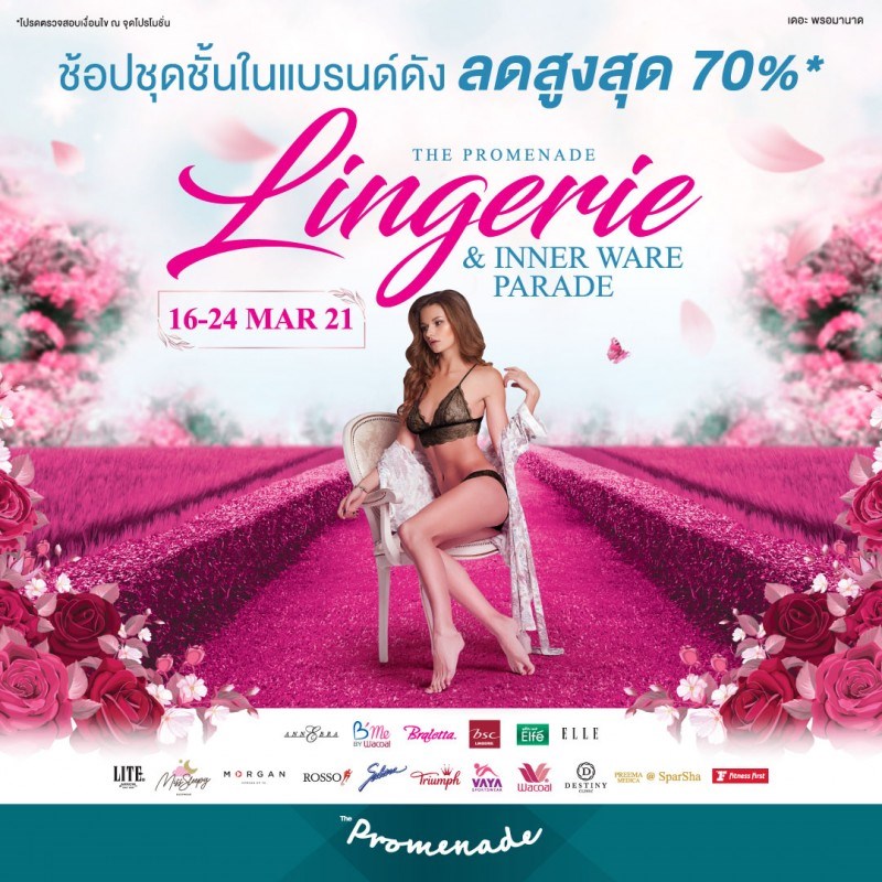 "Lingerie & Inner Ware Parade" วันที่ 16 - 24 มีนาคม 2564 ณ ชั้น 1 ศูนย์การค้าเดอะพรอมานาด พบกับงาน Lingerie & Inner Ware Parade ยกขบวนชุดชั้นในเเบรนด์ดัง หั่นราคาเอาใจสาว ๆ คนพิเศษอย่างคุณ ลดสูงสุดถึง 70% ถึงเวลามาเปลี่ยนบราเพิ่มความปัง
