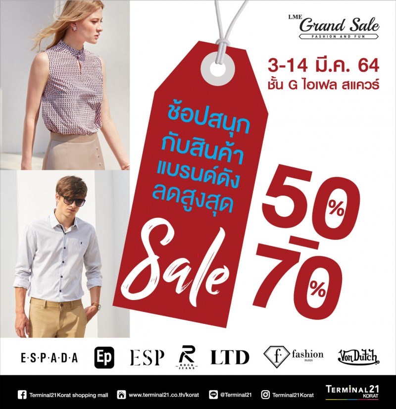 LME Grand Sale วันที่ 3 - 14 มีนาคม 2564 ณ ชั้น G-ไอเฟล สแควร์ Terminal 21 โคราช ปักหมุดรอเลยจ้า LME Grand Sale ช้อปสนุก กับสินค้าแฟชั่นแบรนด์ดังในเครือ LME ลดราคาสูงสุดถึง 70% อาทิ ESPADA , EP , ESP , F-FASHION , LTD , VONDUTCH พร้อมโปร Flash Sale
