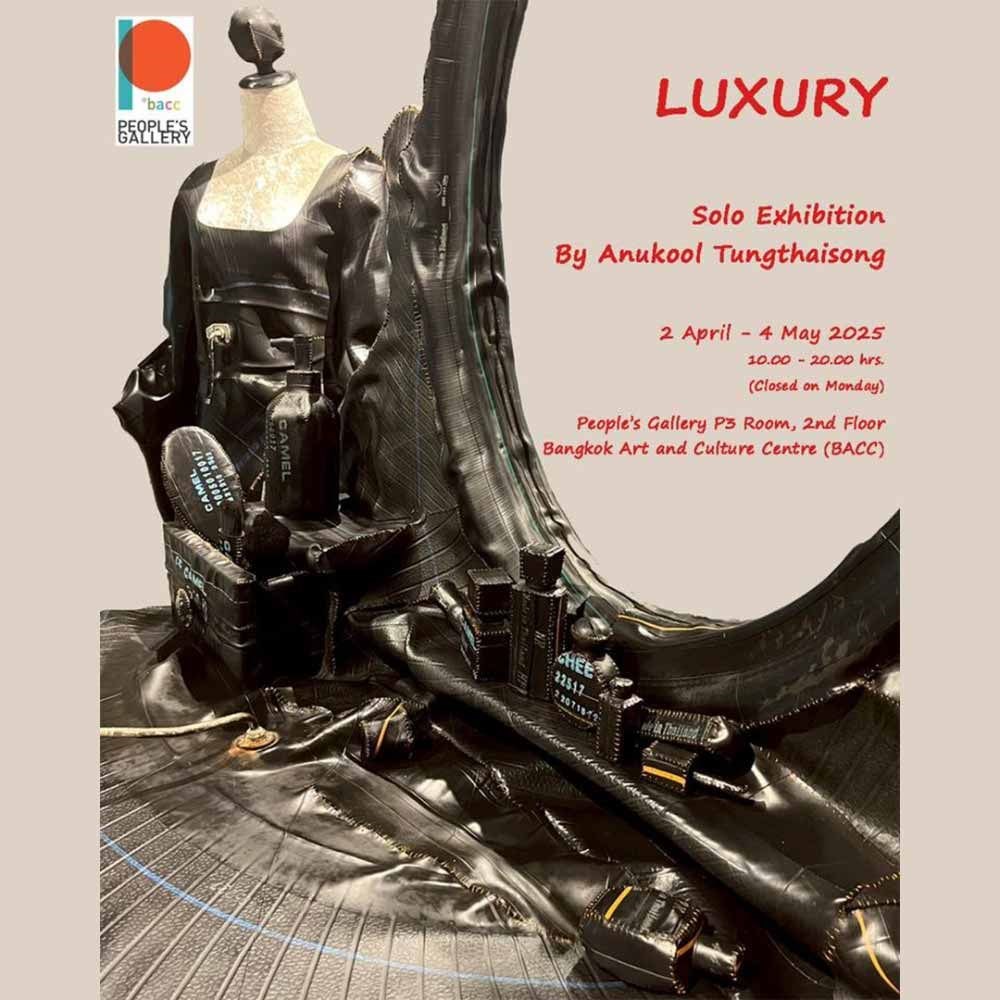 นิทรรศการ LUXURY โดย อนุกูล ทังไธสง นิทรรศการนี้จะพาคุณไปสำรวจเรื่องราวที่ซ่อนอยู่ในทุกชิ้นงาน พร้อมการเปรียบเทียบที่ท้าทายแนวคิดของ “ความหรูหรา” ในมุมมองใหม่ที่ท้าทายจินตนาการ เมื่อวัสดุยางในรถยนต์ถูกนำมาห่อหุ้มลงบนวัตถุหรูหรา เช่น โต๊ะเครื่องแป้ง เครื่องแต่งกาย และเครื่องประดับแบบตะวันตก ซึ่งสร้างความขัดแย้งทางความหมายและสะท้อนถึงการขับเคลื่อนของโลกในรูปแบบแรงงานและค่านิยมที่แตกต่างโดยสิ้นเชิง