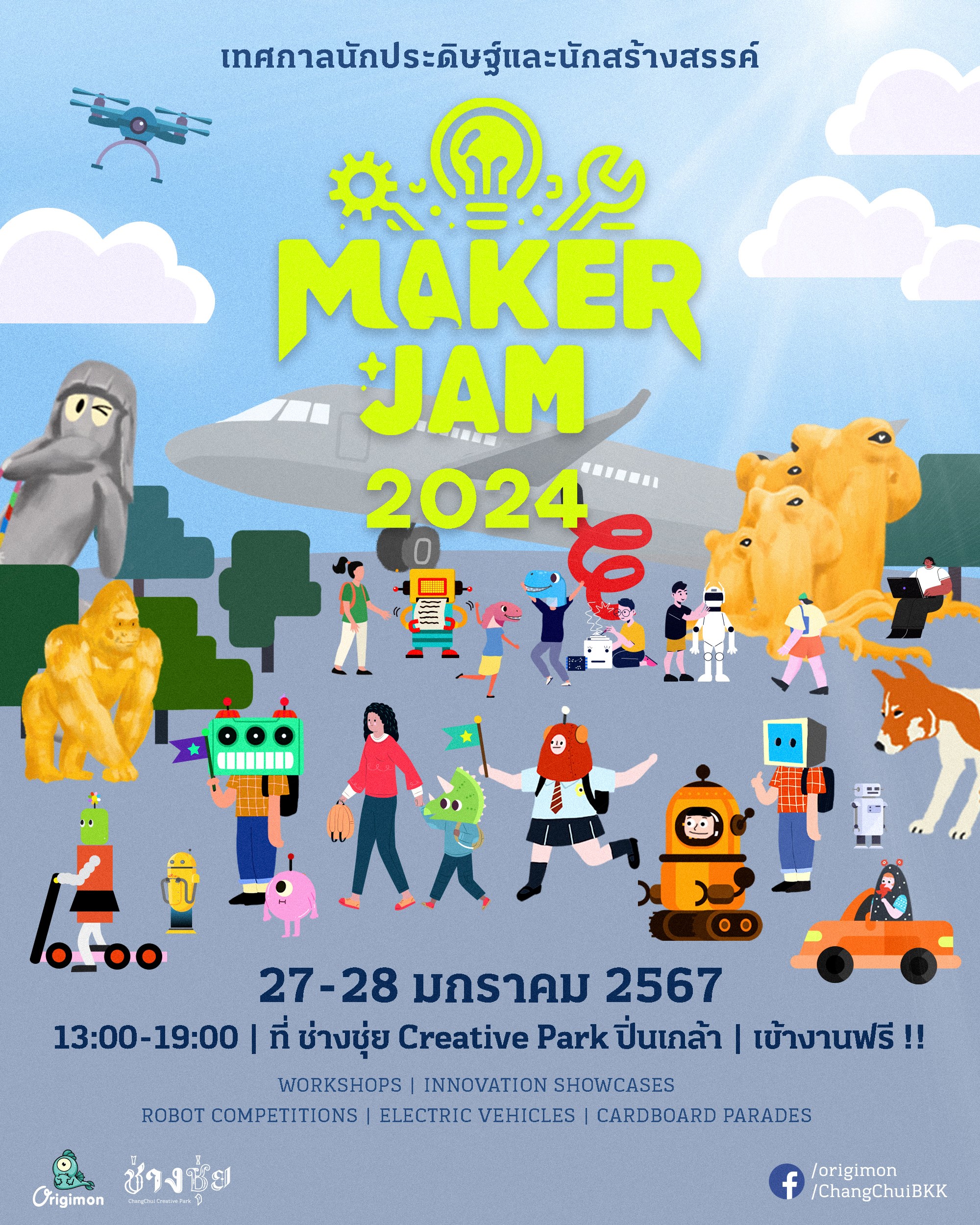 กลับมาอีกครั้ง!! มาร่วมสั่นสะเทือนวงการเมกเกอร์แห่งประเทศไทย “MAKER JAM 2024 เทศกาลนักประดิษฐ์และนักสร้างสรรค์” เสาร์ 27 - อาทิตย์ 28 มกราคม 2567 เวลา 13.00-19.00 น. ที่ ช่างชุ่ย Creative Park ปิ่นเกล้า เข้างานฟรี !! ✈️🌳🔧⚙️🔨🔩🚜🤖