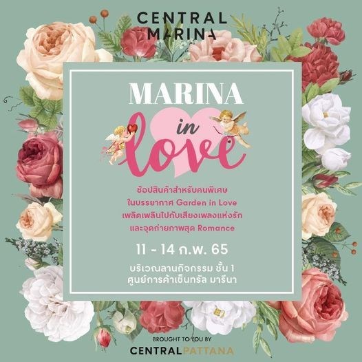 วาเลนไทน์นี้ มาเจอกันที่งาน Marina in Love ช้อปสินค้าสำหรับคนพิเศษ ในบรรยากาศ Garden in Love และเพลิดเพลินกับเสียงเพลงแห่งรัก พร้อมจุดถ่ายภาพสุด Romance วันที่ 11 - 14 ก.พ. 65 ณ บริเวณลานกิจกรรม ชั้น 1 เซ็นทรัลมารีนา