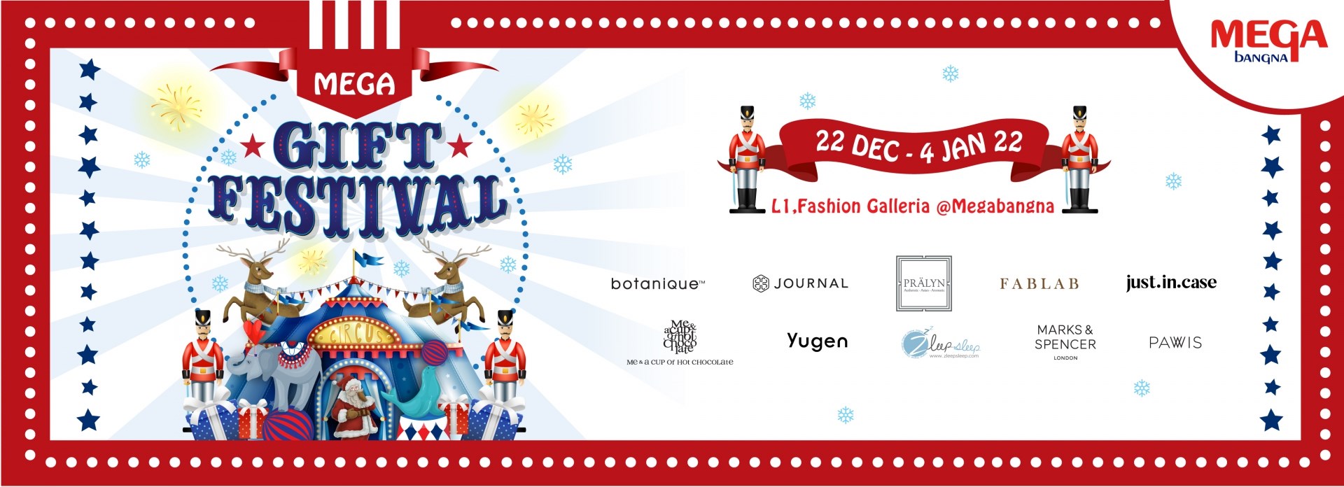 ศูนย์การค้าเมกาบางนา สุดยอดแหล่งช้อปปิ้งและสถานที่พบปะสังสรรค์แห่งย่านกรุงเทพตะวันออก ชวนลูกค้าส่งต่อความสุขด้วยของขวัญ ของฝากสุดพิเศษ พร้อมหลากหลายไอเดียเลือกสรรของขวัญปีใหม่ให้กับคนพิเศษ ในงาน “เมกา กิฟต์ เฟสติวัล” (Mega Gift Festival) ณ โซนแฟชั่น แกลอเรีย ชั้น 1 ระหว่าง22 ธันวาคม 2564 – 4 มกราคม 2565 พบกับสินค้าหลากหลายสไตล์ที่มาให้เลือกสรรเป็นของขวัญเพื่อส่งมอบความสุขในเทศกาลปีใหม่นี้ พร้อมส่วนลดสูงสุดถึง 70% อาทิ ตุ๊กตา เครื่องเขียน เสื้อผ้า กระเป๋า เครื่องประดับ เครื่องนอน แก้วน้ำ และผลิตภัณฑ์เครื่องหอมต่าง ๆ จากแบรนด์ชั้นนำ อาทิ Botanique, Journal, PRALYN, FABLAB, just.in.case, ME & A CUP OF CHOCOLATE, Yugen, Zleep Sleep, MARKS & SPENCER และ PRAWIS เป็นต้น