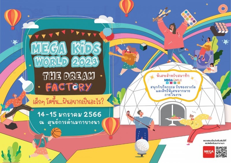 วันเด็กปีนี้... มาร่วมสร้างความฝันของหนู ๆ ไปด้วยกัน ในงาน "MEGA KIDS WORLD 2023 : THE DREAM FACTORY " ระหว่างวันที่ 14 - 15 มกราคม 2566 เวลา 10.00 - 21.00 น. ณ ศูนย์การค้าเมกาบางนา ร่วมสนุกในงานฟรี!