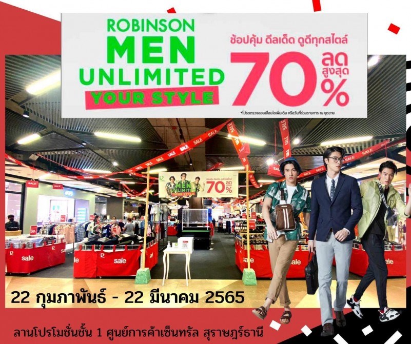 เริ่มต้นด้วยความยิ่งใหญ่พบกับมหกรรม ROBINSON งาน "MEN Unlimited Your Style" สไตล์ที่ไร้ขีดจำกัด ของคุณพบกับเสื้อผ้าสุภาพบุรุษ สุภาพสตรี ลดสูงสุด 70% รองเท้า, กระเป๋า, เสื้อเชิ้ต กับเเบรนด์ ดังชั้นนำเช่น DAKS LONDON, BEVERLY HILLS POLO CLUB, ARROW, MANCHESTER, PLAY BOY, MANWOOD เริ่มตั้งเเต่ 22 กุมภาพันธ์ - 7 มีนาคม 2565 ณ ลานโปรโมชั่นชั้น1 ศูนย์การค้าเซ็นทรัลสุราษฎร์ธานี