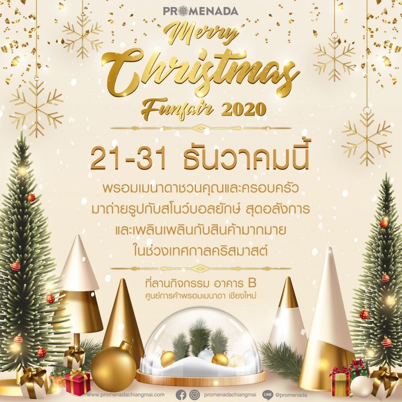 Merry Christmas Funfair 2020 วันที่ 21 - 31 ธันวาคม 2563 ณ ลานกิจกรรม อาคาร B Promenada Chiang Mai พรอมเมนาดาชวนทุกท่านมาถ่ายรูปกับ Snow Ball ยักษ์สุดอลังการ พร้อมจุดถ่ายรูปน่ารักๆอีกเพียบ และเพลินเพลินกับสินค้ามากมายให้คุณได้ส่งมอบให้คนที่คุณรักในช่วงเทศกาลคริสมาสต์ ตั้งแต่วันที่ 21 - 31 ธันวาคม 2563 แล้วเจอกัน ที่ลานกิจกรรม อาคาร B