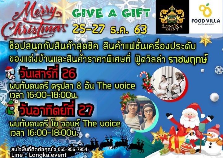 Merry Christmas Give a Gift วันที่ 25 - 27 ธันวาคม 2563 ณ ฟู้ดวิลล่า ราชพฤกษ์ ช็อปสนุกกับสินค้าสุดชิค Flea Market 25 - 27 ธ.ค. 63 Merry Christmas Give a Gift สินค้าแฟชั่นเครื่องประดับ ของแต่งบ้านและสินค้าราคาพิเศษ ที่ ฟู้ดวิลล่า ราชพฤกษ์ สนุกกับกิจกรรมสุดสัปดาห์ วันเสาร์ 26 ธ.ค. พบกับดนตรี ครูปลา & อ้น The Voice 16:00-18:00 น. วันอาทิตย์ 27 ธ.ค. พบกับดนตรี โย จอนห์ The Voice 16:00-18:00 น.
