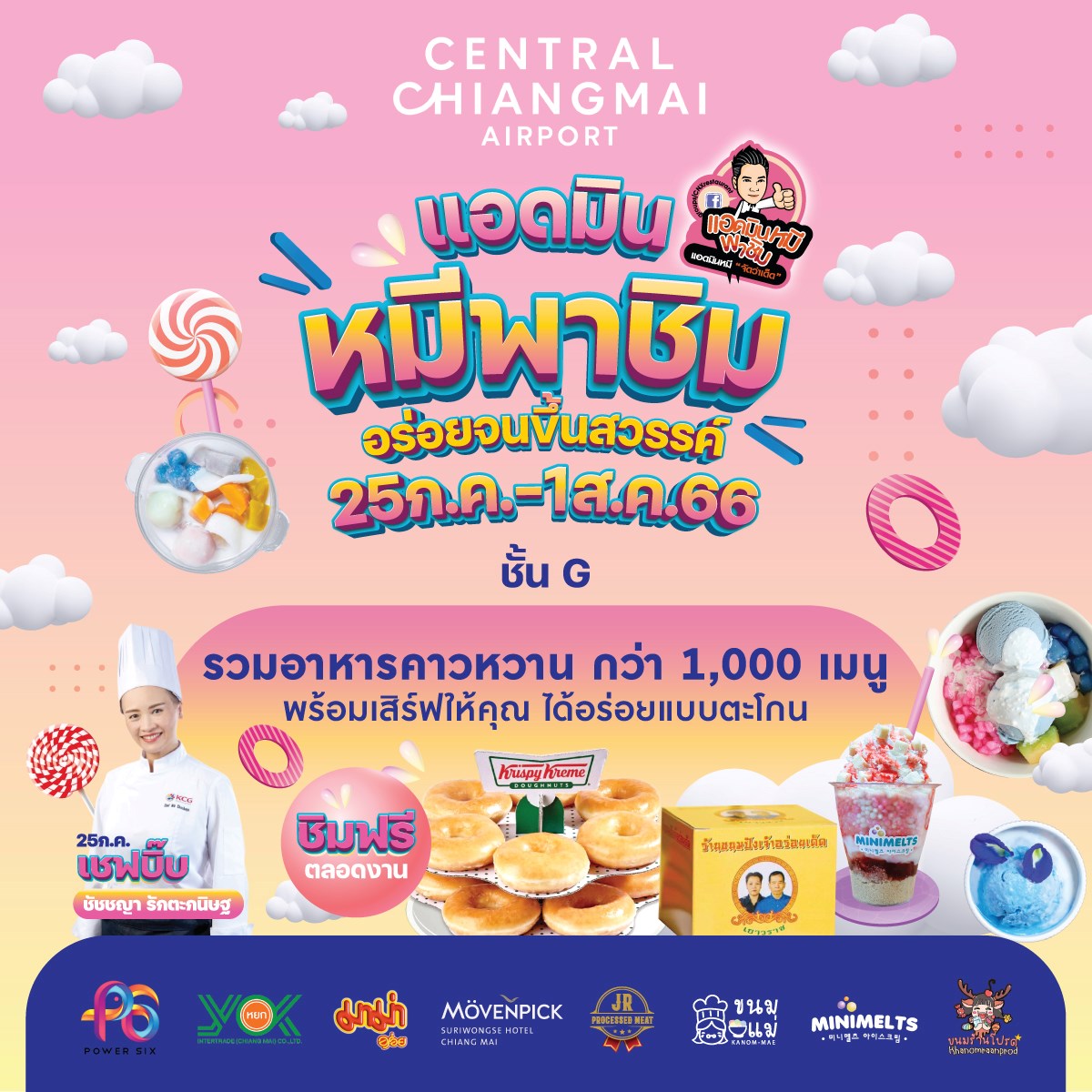 ศูนย์การค้าเซ็นทรัล เชียงใหม่ แอร์พอร์ต ร่วมกับเพจแอดมินหมี ชวนคุณมาอิ่มฟินเพื่อตอกย้ำความเป็น Food Destination ยกขบวนอาหารทั้งคาว หวาน และของทานเล่นสุดฟินกว่า 1,000 เมนู จากร้านดังอาทิ ขนมร้านโปรด, JR ไส้กรอกโฮมเมด, Minimelts, ธาราทุเรียน, ขนมแม่, For You ถังหูลู่, น้ำเงี้ยวอ้อมเมือง, Yakuza Oden, Take Me Home, Enjoy Lasagna, นาซิ จำปู และอีกมากมาย ชิมฟรี! ตลอดทั้งงาน พร้อมกิจกรรมสุดพิเศษ