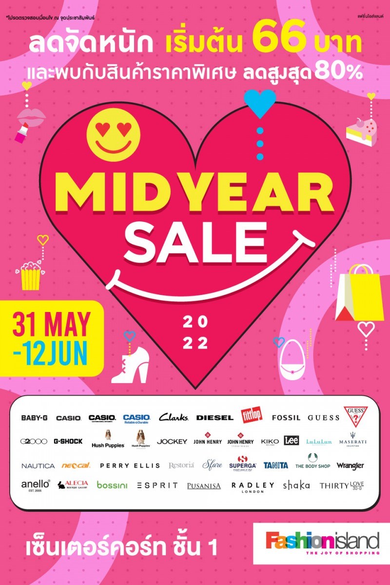 MID YEAR SALE 2022 วันที่ 31 พฤษภาคม - 12 มิถุนายน 2565 ณ ศูนย์การค้าแฟชั่นไอส์แลนด์ ชวนมามาช้อปให้หายคิดถึง ที่งาน MID YEAR SALE 2022 งานที่รวบรวมแบรนด์ดังมาจัดโปรโมชั่นลดสูงสุดถึง 80% พร้อม Deal of the Day สินค้าราคาพิเศษทุกวัน ที่คัดสรรมาเพื่องานนี้โดยเฉพาะ กับแบรนด์ดังที่คุณเองก็ไม่ควรพลาด อาทิ CASIO, Clarks, DIESEL, FitFlop, FOSSIL, GUESS, G2000, G-SHOCK, Hush Puppies, JOCKEY, JOHN HENRY, KIKO MILANO, Lee, LuLuLun, MASERATI, NAUTICA, neocal, PERRY ELLIS, Restoria, SUPERGA, TANITA, The Body Shop, Erangler, anello, Alecia Boutique Gallery, bossini, ESPRIT, PUSANISA, RADLEY LONDON, shaka, THIRTY LOVER และอื่น ๆ อีกมากมาย ตั้งแต่วันนี้ - 12 มิ.ย. 65 ณ เซ็นเตอร์คอร์ท ชั้น 1 ศูนย์การค้าแฟชั่นไอส์แลนด์
