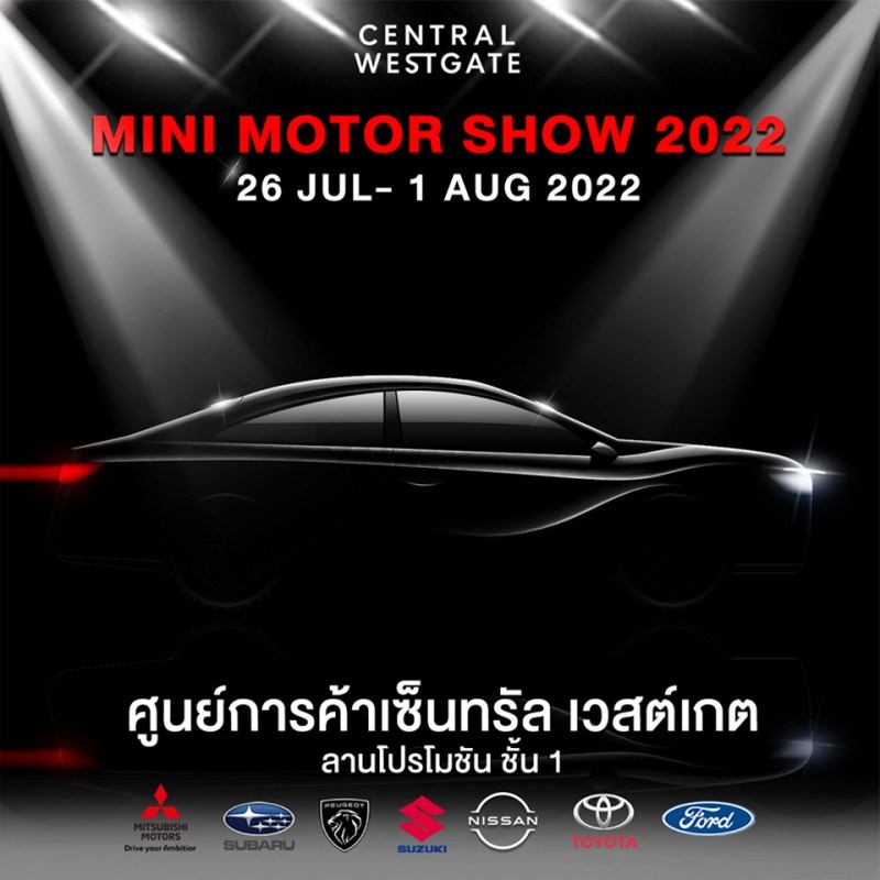 MINI MOTOR SHOW 2022 วันที่ 26 กรกฎาคม - 1 สิงหาคม 2565 ณ เซ็นทรัล เวสต์เกต MINI MOTOR SHOW 2022 พบกับยานยนตร์หลากหลายแบรน์ อาทิ Suzuki / Subaru / Mitsubishi motor / Peugeat / Nissan / Toyota / Ford พร้อมรับข้อเสนอพิเศษสุดทุกค่าย ฟรี! ประกันภัยชั้น 1 ทุกรุ่น สามารถทดลองขับได้ทุกค่าย ที่ปรึกษาการขายและเจ้าหน้าที่สวมหน้ากากอนามัย พร้อมFace Shield บริการเจลแอลกอฮอล์ล้างมือฆ่าเชื้อโรค รถจัดแสดง โต๊ะปิดการขาย อุปกรณ์ต่างๆ ทำความสะอาดทุกๆ1 ชั่วโมง รถทดสอบมีการทำความสะอาด และฆ่าเชื้อภายในรถทุกครั้งหลังจากมีการทดสอบรถ