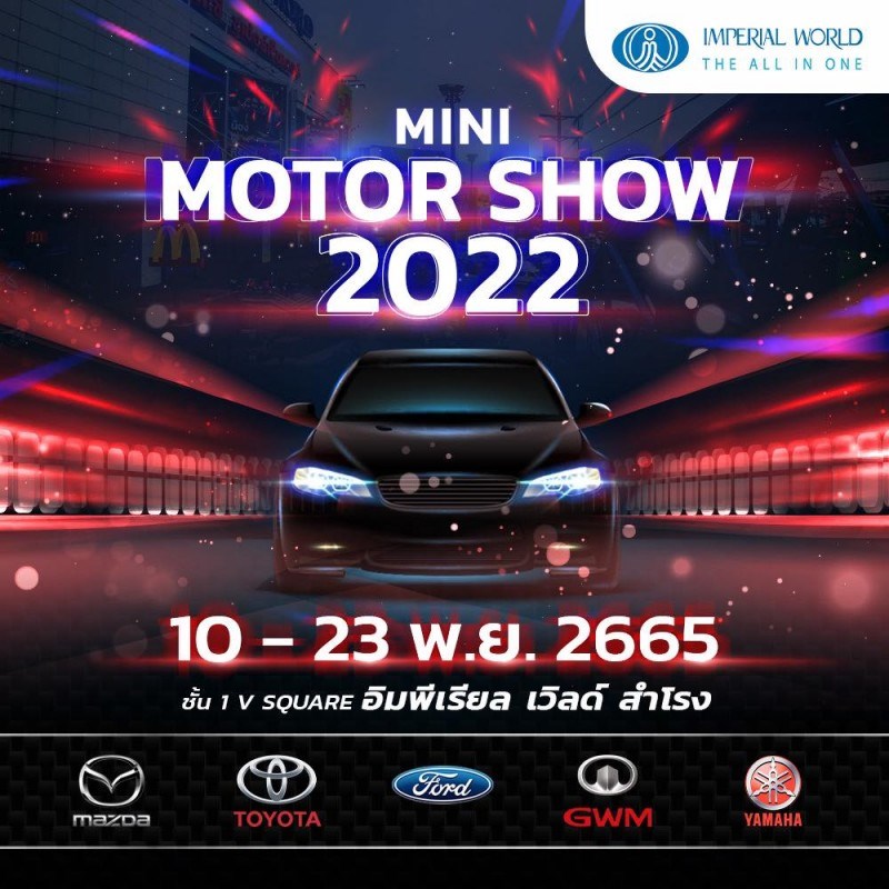 MINI MOTOR SHOW 2022 สัมผัสกับที่สุดของความแกร่ง เหนือระดับ มหกรรมยานยนต์ พบข้อเสนอสุดพิเศษจากค่ายรถชั้นนำ ตั้งแต่วันที่ 10 - 23 พ.ย. 65 ณ บริเวณ V SQUARE ชั้น 1 ศูนย์การค้าอิมพีเรียล เวิลด์ สำโรง