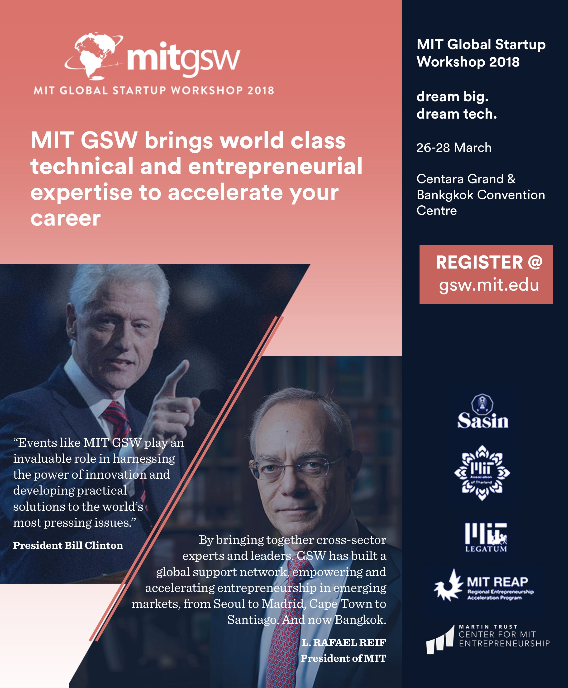 We're pleased to announce that registration is now open for the 21st annual MIT Global Startup Workshop! In association with Sasin School of Management and the MIT Association of Thailand, we'll be convening inBangkok, Thailand from March 26-28, 2018.