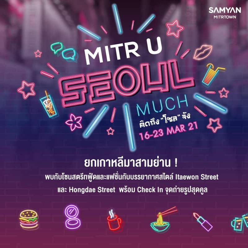 MITR U SEOUL MUCH คิดถึง"โซล"จัง วันที่ 16 - 23 มีนาคม 2564 ณ ศูนย์การค้าสามย่านมิตรทาวน์ ยกเกาหลีมาสามย่าน! พบกับโซนสตรีทฟู้ดและแฟชั่นกับบรรยากาศสไตล์ Itaewon Street และ Hongdae Street พร้อม Check In จุดถ่ายรูปสุดคูล