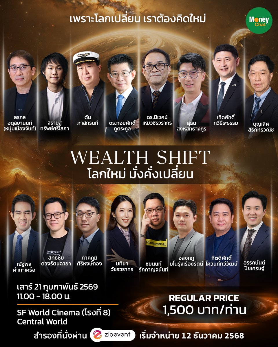 ทาง Money Chat สื่อด้านเศรษฐกิจ การเงิน และการลงทุน พร้อมนำเสนอองค์ความรู้ที่สอดคล้องกับการเปลี่ยนแปลงครั้งนี้ จึงได้จัดงาน MONEY CHAT MEET AND GREET #5 ภายใต้ตีม WEALTH SHIFT: โลกใหม่ มั่งคั่งเปลี่ยน เพื่อเปิดมุมมองใหม่ต่อเศรษฐกิจโลก การลงทุน และโอกาสที่จะกำหนดอนาคตความมั่งคั่งในยุคเปลี่ยนผ่าน
