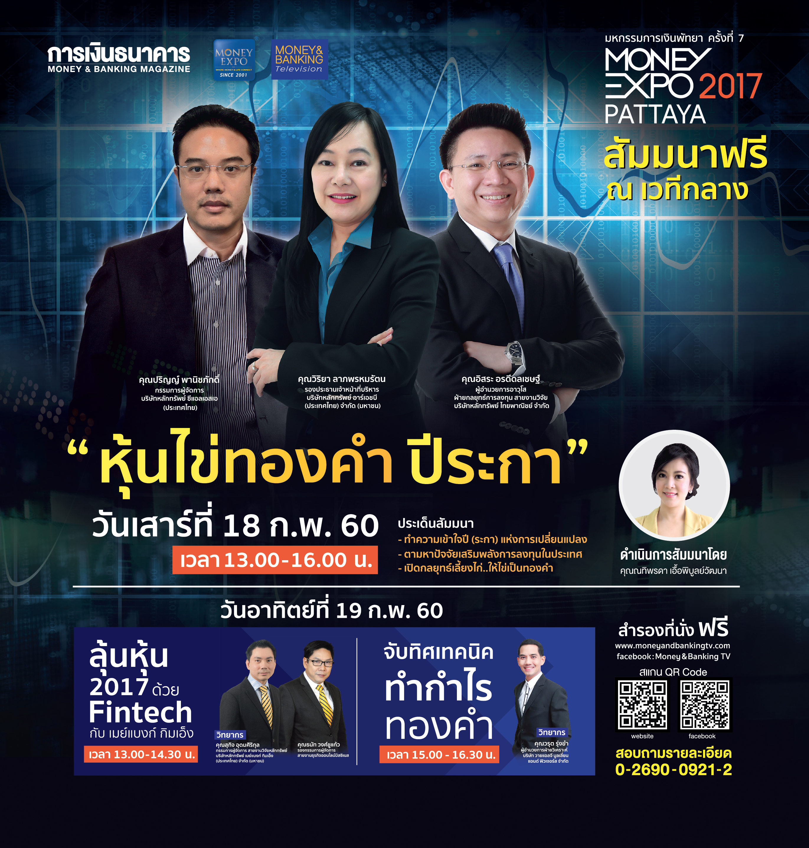งานมหกรรมการเงินพัทยา ครั้งที่ 7 Money Expo Pattaya 2017 ประเดิมแนวคิด การจัดงานประจำปี 2560 “นวัตกรรมการเงิน 4.0 Financial Innovation 4.0” พร้อมส่งตรงบริการทางการเงินและการลงทุนครบวงจรถึงมือลูกค้าประชาชน