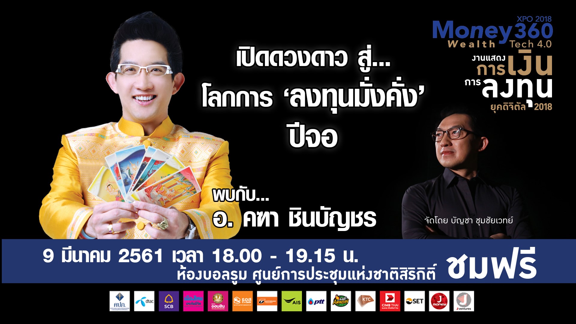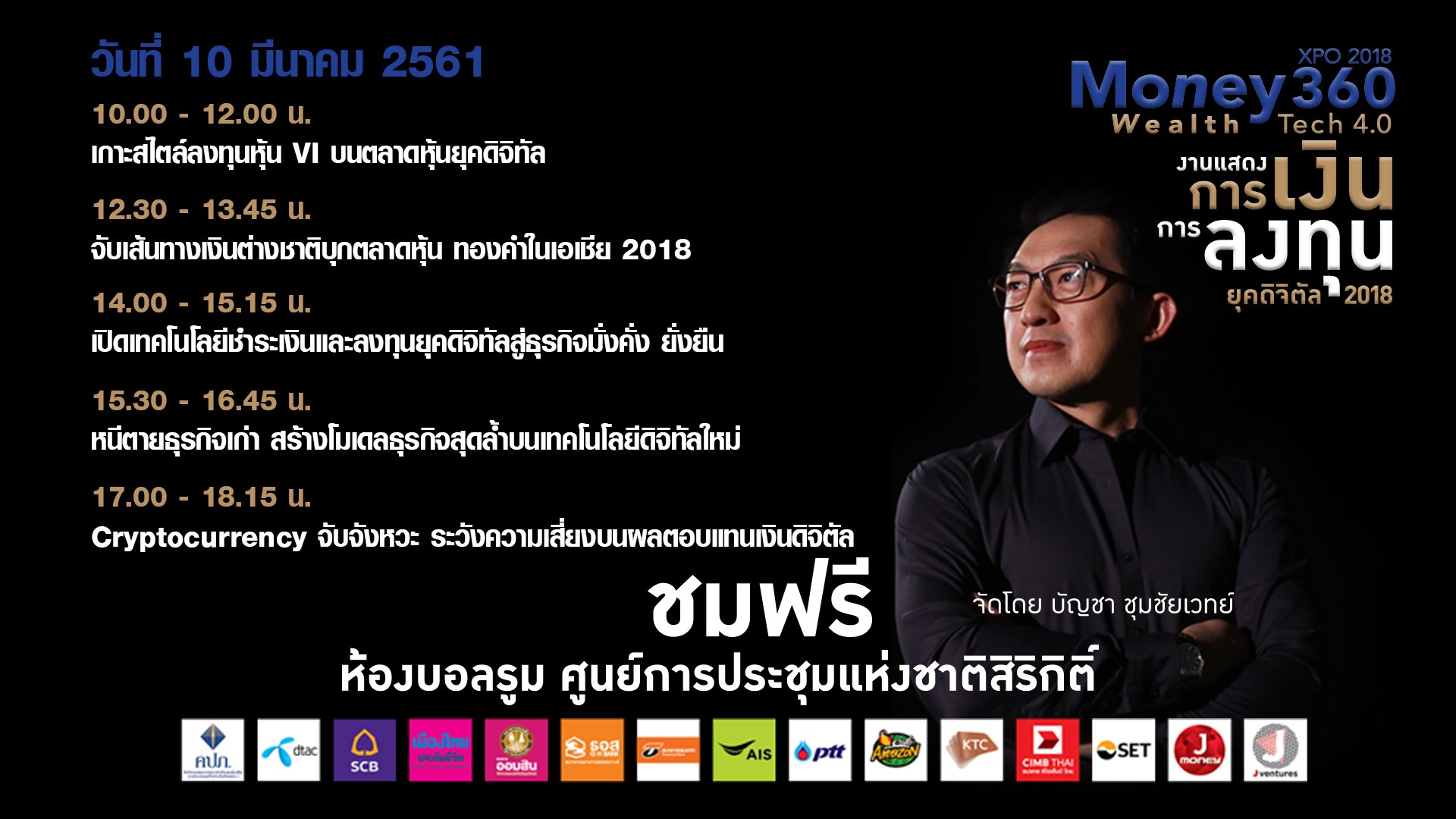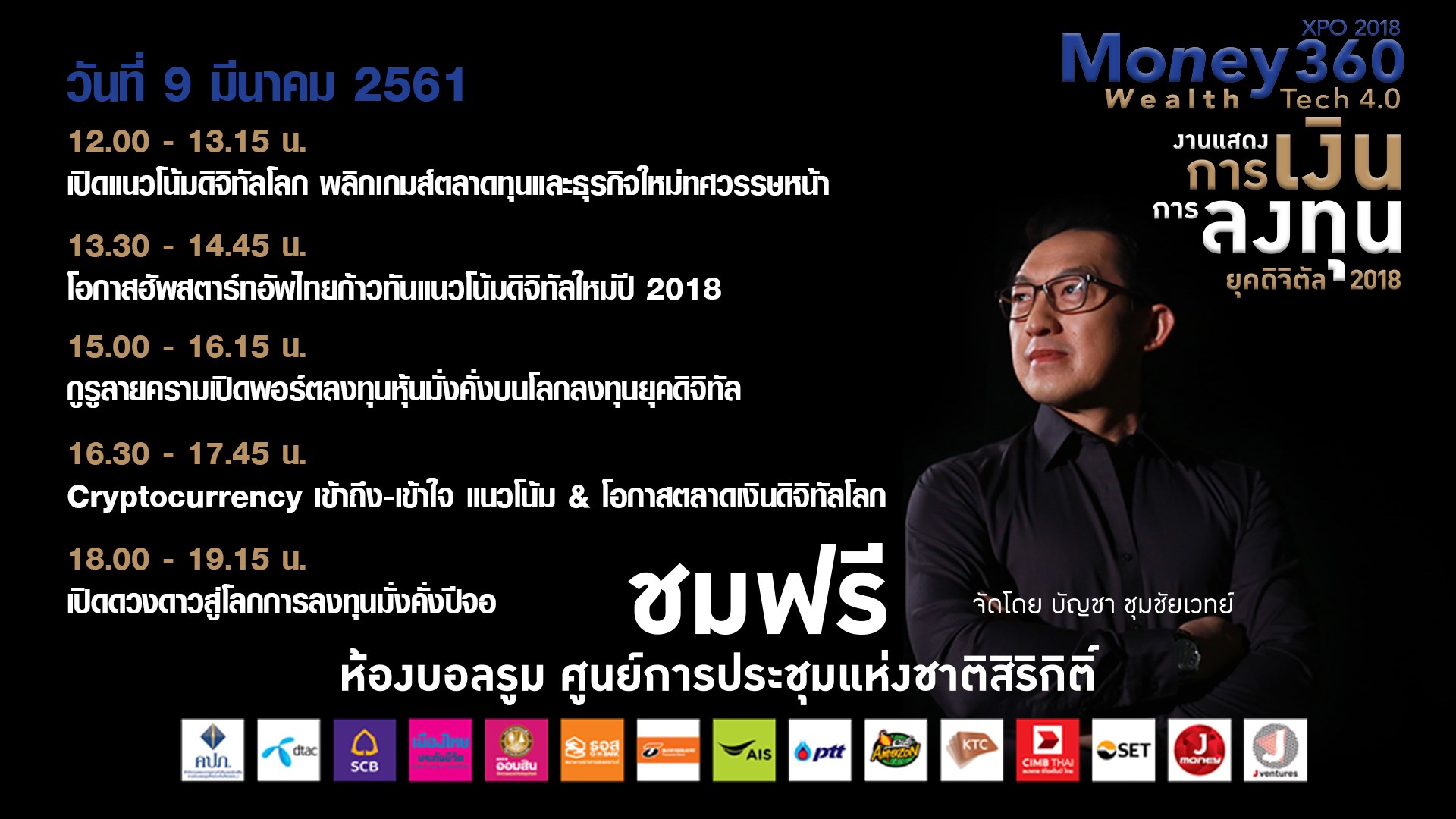 Money360 XPO 2018 หรืองานแสดงการเงินการลงทุนทั้งในประเทศ และต่างประเทศบนยุคเทคโนโลยีดิจิตัล 2018 จัดขึ้นระหว่างวันที่ 9 - 11 มีนาคม 2561 เวลา 10.00 - 19.00 น. ที่ศูนย์สิริกิติ์ จัดโดย คุณบัญชา ชุมชัยเวทย์ พิธีกรรายการข่าววิเคราะห์เศรษฐกิจการเงินการลงทุน ที่มีประสบการณ์มานานกว่า 15 ปี สำหรับปี 2561 งาน
