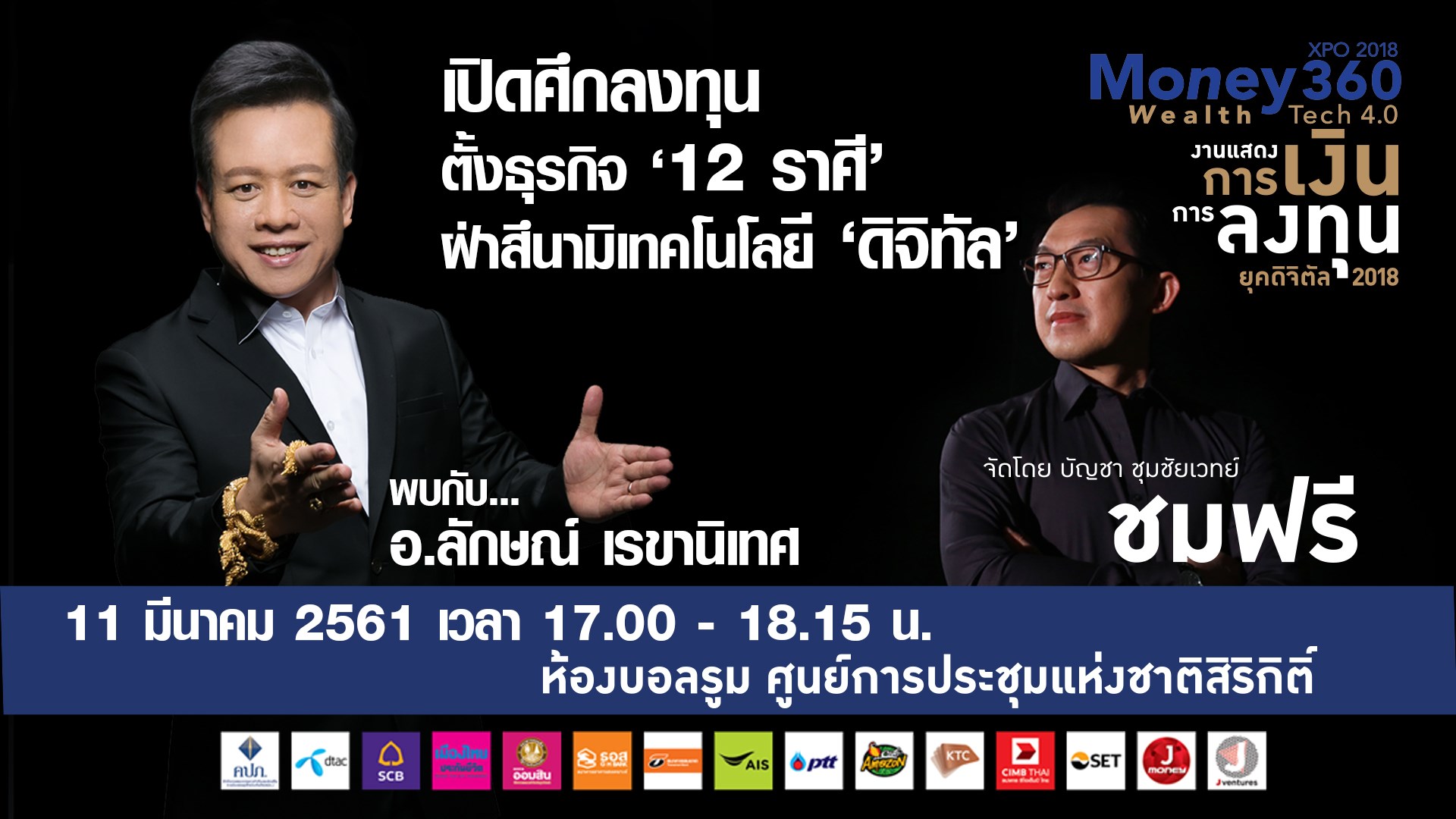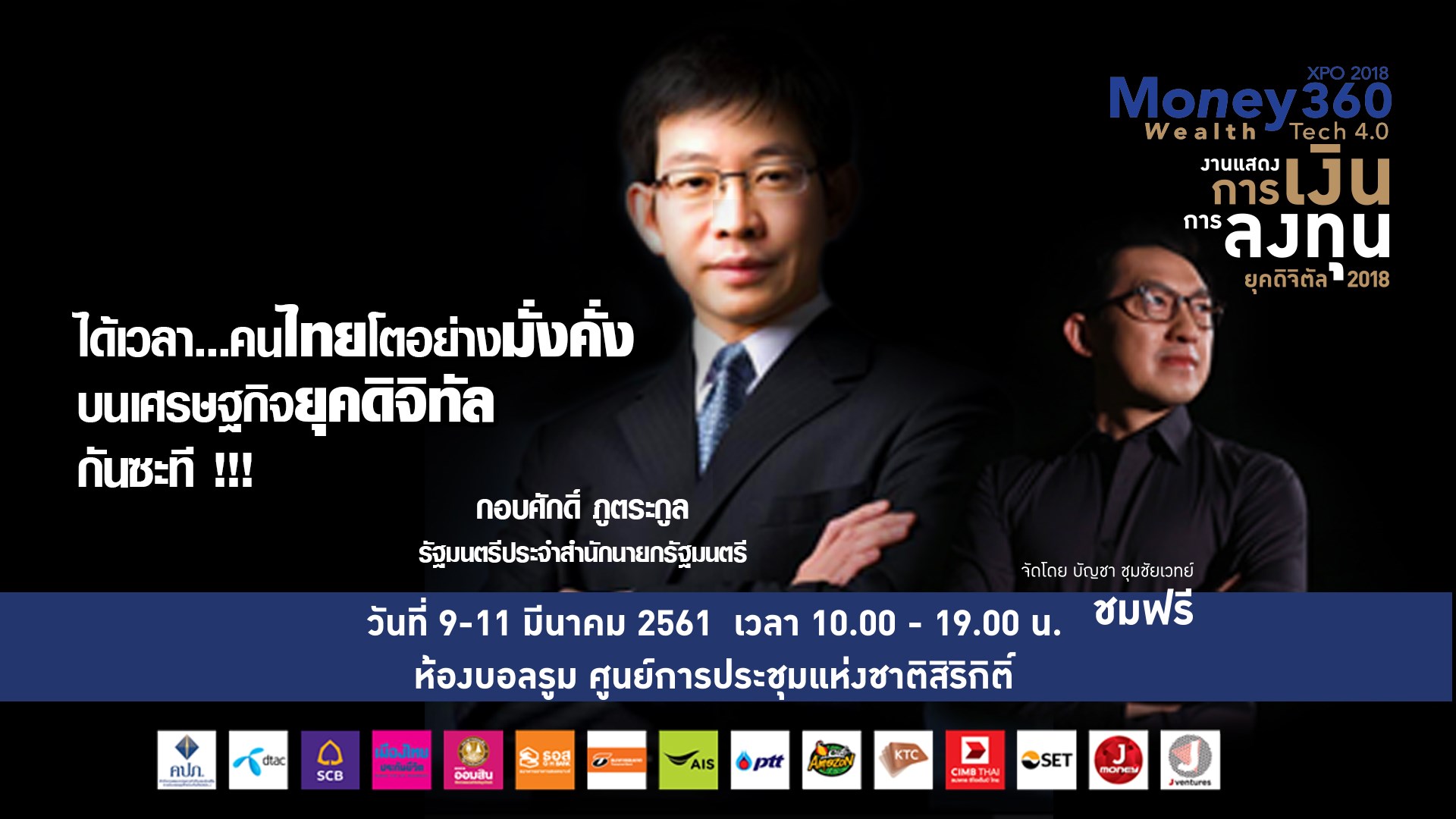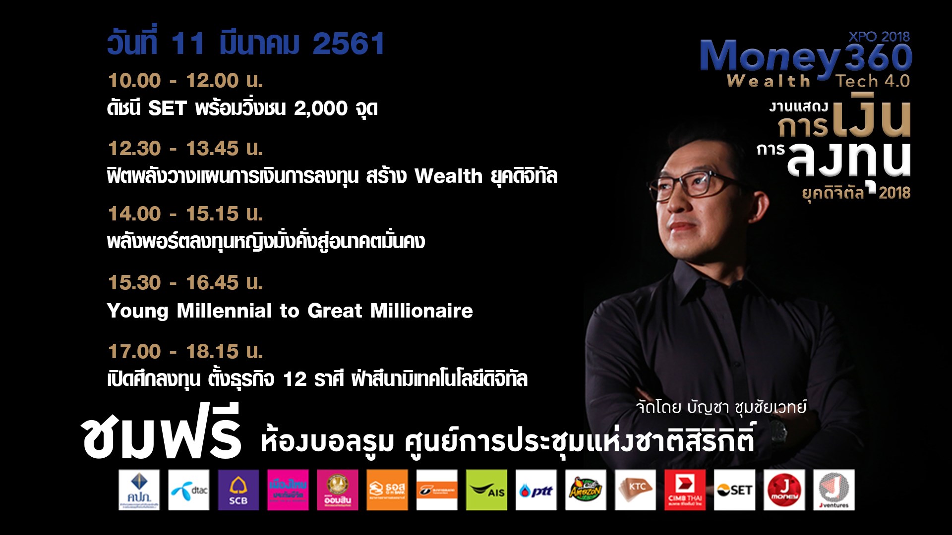 Money360 XPO 2018 หรืองานแสดงการเงินการลงทุนทั้งในประเทศ และต่างประเทศบนยุคเทคโนโลยีดิจิตัล 2018 จัดขึ้นระหว่างวันที่ 9 - 11 มีนาคม 2561 เวลา 10.00 - 19.00 น. ที่ศูนย์สิริกิติ์ จัดโดย คุณบัญชา ชุมชัยเวทย์ พิธีกรรายการข่าววิเคราะห์เศรษฐกิจการเงินการลงทุน ที่มีประสบการณ์มานานกว่า 15 ปี สำหรับปี 2561 งาน
