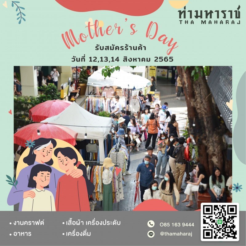 ในวันหยุดยาวนี้ เนื่องในโอกาสวันแม่ ท่ามหาราช อยากเชิญชวนร้านค้า ไม่ว่าจะร้านอาหาร ของทานเล่น เครื่องดื่ม หรือ ร้านเสื้อผ้าแฟชั่น งานคราฟท์ มาร่วมออกร้าน และเป็นส่วนหนึ่งในกิจกรรมวันแม่ ณ วันที่ 12-14 สิงหาคม 2565