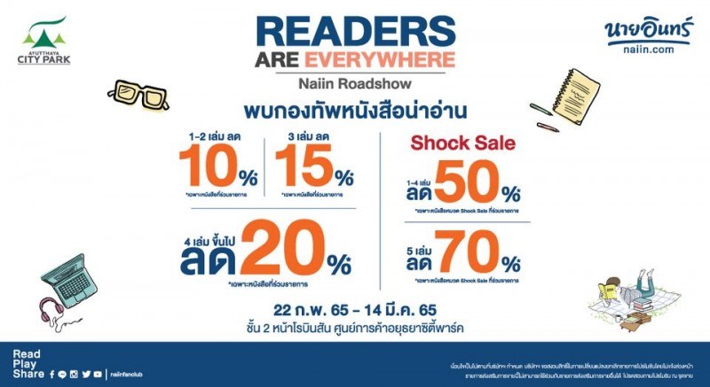 Naiin Roadshow วันที่ 22 กุมภาพันธ์ - 14 มีนาคม 2565 ณ ศูนย์การค้าอยุธยาซิตี้พาร์ค นายอินทร์ขนกองทัพหนังสือ น่าอ่านมาให้เลือกกันถึงที่ Naiin Roadshow ในราคาสุดคุ้ม โดนใจ ลดสูงสุดถึง 70% ตั้งแต่วันนี้ - 14 มี.ค. 65 ณ ชั้น 2 หน้าโรบินสัน อยุธยาซิตี้พาร์ค