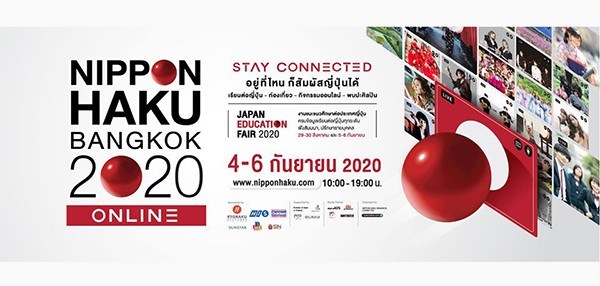 STAY CONNECTED! ไม่ว่าจะอยู่ที่ไหน ก็ยังสัมผัสญี่ปุ่นได้ มหกรรมญี่ปุ่นนิปปอนฮาคุ NIPPON HAKU BANGKOK 2020 วันที่ 4 - 6 กันยายน 2563 เวลา 10.00 - 19.00 น. ร่วมงานฟรี! ปีนี้พบกันทางออนไลน์! www.nipponhaku.com และ Facebook : NIPPON HAKU BANGKOK จัดโดยสถาบันสอนภาษา - ศูนย์แนะแนวศึกษาต่อประเทศญี่ปุ่นเจเอ็ดดูเคชั่น