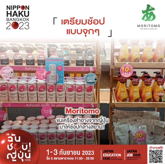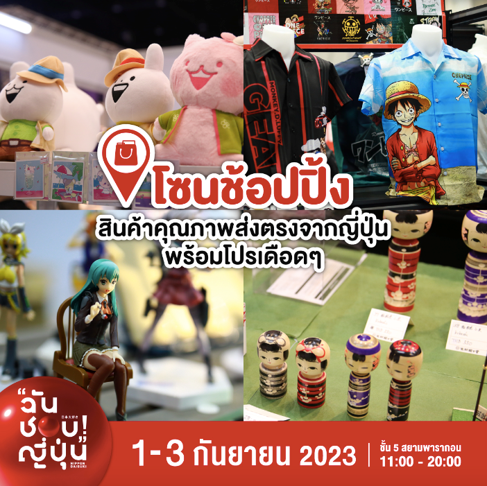 • มาต่อที่โซนช้อปปิ้ง ที่เราจัดขบวนกองทัพสินค้าคุณภาพดีหลากหลายรายการ จากร้านค้าแบรนด์ดังพร้อมทั้งสินค้าสิขสิทธิ์แท้ส่งตรงจากญี่ปุ่น พร้อมดีลโปรโมชั่นสุดพิเศษที่มีแค่เฉพาะภายในงานนี้เท่านั้น ไม่ว่าจะเป็น Japan Anime Movie, HIROSHIMA UOSHO KUMIAI, YAMAMORI, HINATAMIRAI, S&B FOODS, Sonoriku, KIKKOMAN SOYMILK, BACCHUS, KARAMUCHO, KKM PRODUCTS, Marumura, JAPANMASE, Beautiful Shizuoka, TOKYO SME SUPPORT CENTER, Mitsubishi Pencil, EAST table, KENKO SHOP, WAWAWA. creators marche, Anti-Counterfeit, MASCOTEERS, OMP (Oh My Pop), Hoyu Trading – Bigen, Trim Supersol, PENTEL, Nippon Pet Food, Moritomo เป็นต้น