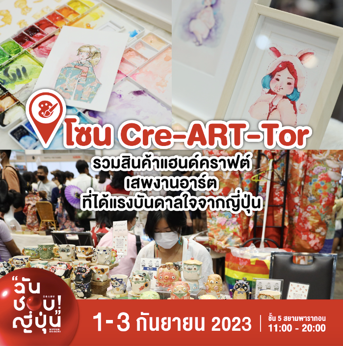 • โซนตลาดนัดสินค้า Cre-Art-Tor โซนสินค้าไอเดียจากนักสร้างสรรค์ที่มีแรงบันดาลใจจากญี่ปุ่น พร้องด้วยงานแสดงผลงานของเหล่านักสร้างสรรค์ และนักเรียนไทยในญี่ปุ่น ไม่ว่าจะเป็น หมี่แห้งฯ งานคราฟท์พับกระดาษโอริกามิ, KenjiDamaru งานวาดลายเส้นสีน้ำ, ร้านของขวัญพันราตรี, Yak's Factory, Anuntakan Studio เครื่องประดับจากดอกไม้ผ้าญี่ปุ่น, ps.midsummer งานคราฟท์จากเรซิ่น, Triskè le AOC ร้านเครื่องประดับ, Bubble_moon เครื่องประดับที่ได้แรงบันดาลใจจากซากุระ, ร้านโครเชต์ Sweetmori, ร้านเครื่องประดับ Fairy Dust, ร้านพวงกุญแจ Sweet Resin, งานโปสการ์ด สติ๊กเกอร์ และพวงกุญแจส่วนใหญ่เป็นรูปสถาปัตยกรรมญี่ปุ่น จากร้าน Pepper's Papers, character น้องหมาพนักงานออฟฟิศ จาก Zky.studio, ลายเส้นสีน้ำ สัตว์ที่คนญี่ปุ่นชอบ จาก Mokami555, สินค้าจากคาแรคเตอร์สไตล์ญี่ปุ่น ccraftster, ของชำร่วยและเครื่องประดับจากดอกไม้ Fairy's Tresor, ตุ้กตาแมวจากเซรามิก Gim Neko และ เซรามิกแฮนด์เมด จากร้าน Plookji อีกด้วย