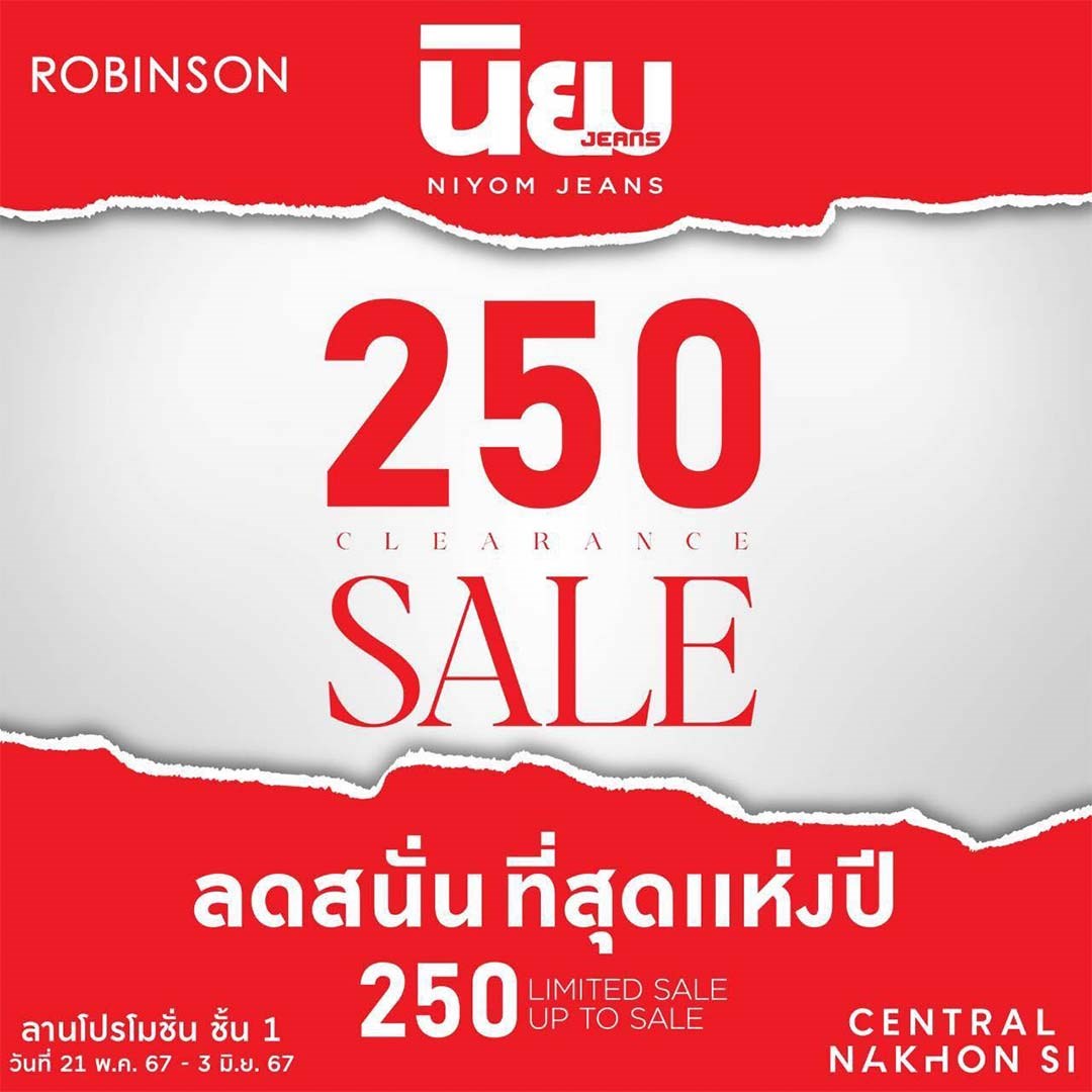 Niyom Jeans Big Clearance Sale "ราคาเดียว 250 บาท" โรบินสันโอเชี่ยนนครศรีธรรมราช2 (เซ็นทรัล นครศรี) จัดงาน Sale ยิ่งใหญ่แห่งปี นิยมยีนส์ ลดเยอะที่สุดที่เคยมีมา ลดเยอะที่สุดแห่งปี ลดกว่านี้ ไม่มีอีกแล้ว กับไอเทมนิยมยีนส์ยอดฮิต อาทิ • กางเกงยีนส์ขายาว • กางเกงขาสั้น • กระโปรง • เสื้อแจ็คเก็ตยีนส์ • ยีนส์คาโก้ • กางเกงชิโน และอีกมากมาย ทุกคอลเลคชั่นที่เราเคยมี จะมาให้เลือกอย่างจัดเต็ม ขายกันไปเลยราคาเดียว 250 บาทเท่านั้น!