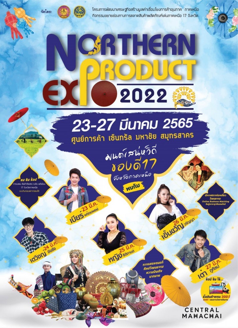 วันที่ 23 - 27 มีนาคม 2565 ณ ศูนย์การค้าเซ็นทรัลพลาซา มหาชัย เชิญชมงาน Norther Product Expo 2022 มนต์เสน่ห์วิถี ของดี 17 จังหวัดภาคเหนือ ระหว่างวันที่ 23 - 27 มีนาคมนี้ ณ ศูนย์การค้าเซ็นทรัลพลาซา มหาชัย จังหวัดสมุทรสาคร ช้อปเพลิน ม่วนใจ๋ กับของดีผลิตภัณฑ์เด่น สินค้าเด่นของกลุ่ม 17 จังหวัดภาคเหนือ ชิมอาหารอร่อย ลำแต้ ๆ ของกินถูกปาก ของฝากถูกใจ ชมการสาธิตหัตถกรรมล้านนา ซื้อสินค้าในงานลุ้นรับของรางวัลฟรี เชื่อมโยงเครื่อข่ายธุรกิจ ในการร่วมเจรจาธุรกิจ ผ่านระบบออนไลน์และออนไซด์ ฟรี สนุกสนานกับการแสดงศิลปวัฒนธรรมภาคเหนือพร้อมศิลปินดังมากมาย วันที่ 23 มีนาคม 2565 : เบียร์ พร้อมพงษ์ วันที่ 24 มีนาคม 2565 : เตวิชญ์ ชัยธัช วันที่ 25 มีนาคม 2565 : หญิง ธิติกานต์ วันที่ 26 มีนาคม 2565 : เอิ้นขวัญ วรัญญา วันที่ 27 มีนาคม 2565 : เต๋า ภูศิลป์ พิเศษ เมื่อซื้อสินค้าทุก 300 บาท รับคูปอง ลุ้นของรางวัลในงานฟรีทุกวัน พลาดไม่ได้ 23 - 27 มีนาคมนี้ ณ ศูนย์การค้าเซนทรัลพลาซามหาชัย จังหวัดสมุทรสาคร สัมผัสความสุขแบบนิว นอร์มอล โดย สำนักงานพาณิชย์จังหวัดน่าน และสำนักงานพาณิชย์ 16 จังหวัดภาคเหนือ..มาแอ่วกั๋นเน่อเจ้า